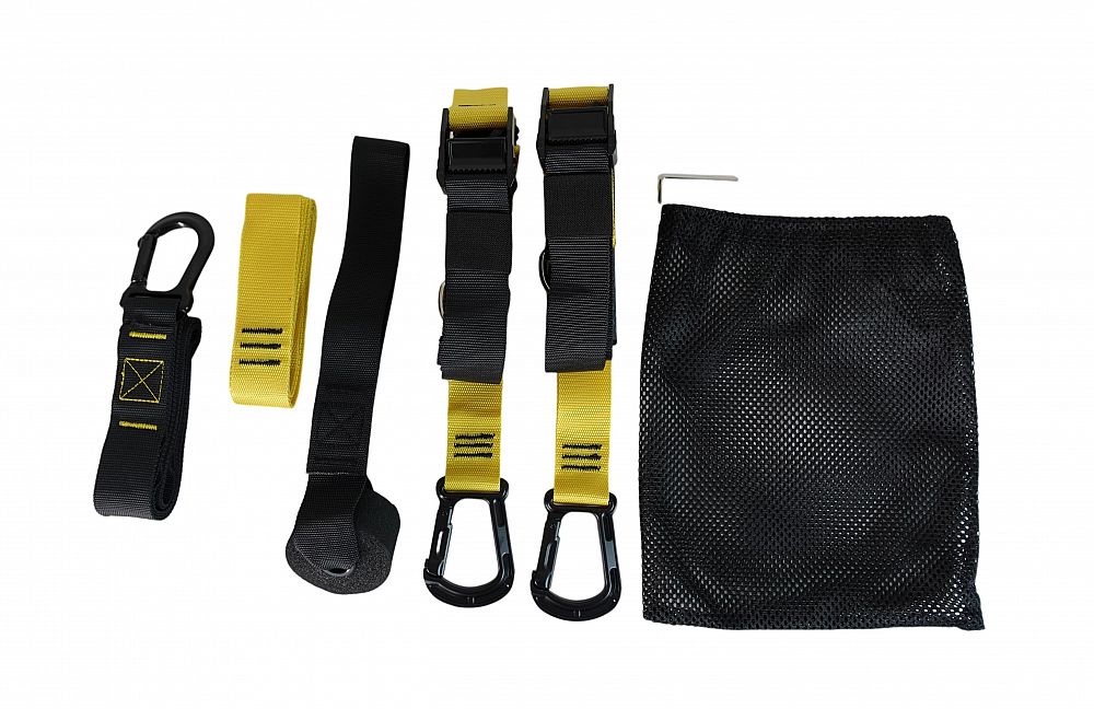 - Dva pevné popruhy s nastaviteľnou dĺžkou: Tieto popruhy sú zakončené gumovými (TPR) madlami, ktoré je možné použiť ako pre ruky, tak aj pre nohy. Popruhy je možné používať samostatne podľa potreby.