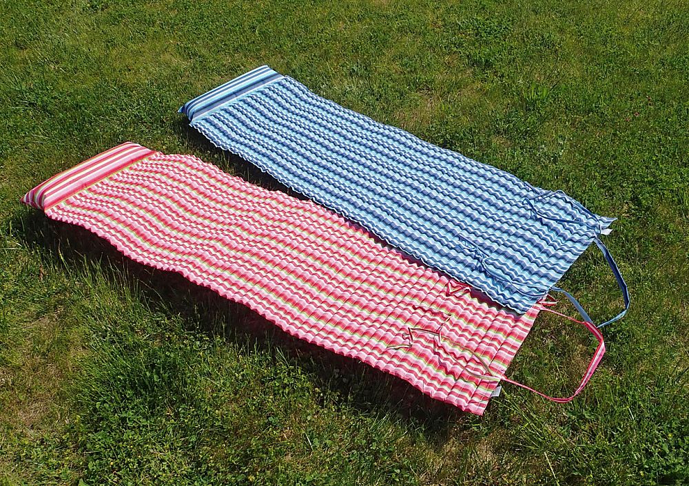 Plážové rolovacie ležadlo s podhlavníkom - nový a veľmi skladný typ lehátka o rozmere 184 x 55 x 1,5 cm. Výplní sú rúry z nenasáklivého molitanu, do seba vzájomne zapadajúce a umožňujúce úsporné zloženie lehátka do úhľadného balíčka.