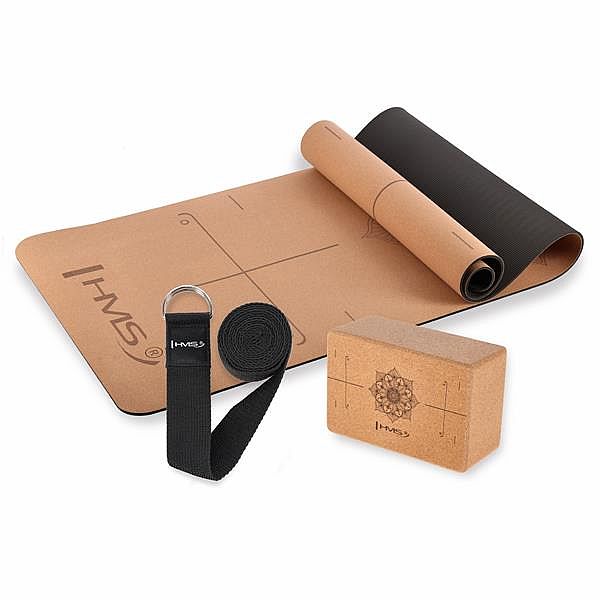 Korková sada na jogu HMS - podložka YM11, jóga blok KJ02 a popruh SJ02