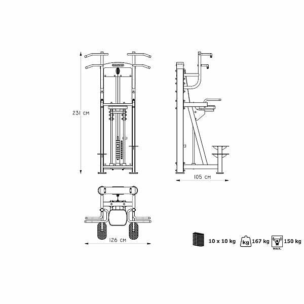 Multifunkčná hrazda s dopomocou MARBO MP-U231 je nekompromisné, profesionálne vybavenie pre Vašu posilňovňu. Na výrobu boli zvolené oceľové profily 120x60x3mm a 80x40x3mm, ktoré zaručujú nečakanú trvanlivosť. Záťaž tvorí 10ks 10kg tehál. Celková váha závažia dodávaná so strojom je teda 100kg. Stroj disponuje dvoma nášľapmi z drážkovaného plechu o rozmeroch 32x17cm a každý je v inej výške. Ich umiestnenie a rozmer minimalizujú riziko poranenia, ale uľahčujú výstup do pracovnej pozície. Polstrovanie je zo syntetickej kože zošitej režnou niťou značky COATS vyplnené tvrdou penou, to celé je na 3mm hrubej, oceľovej doske. Tichý chod zaisťuje zakrytovanie čiernym plastom, z prednej časti je kryt opatrený priehľadom pre ľahké nastavenie požadovaného počtu tehál. Stroj je navyše vybavený veľkou samolepkou, ktorá inštruuje cvičencov, aké cviky idú na stroji vykonávať a ktoré skupiny svalov daný cvik posilňuje.