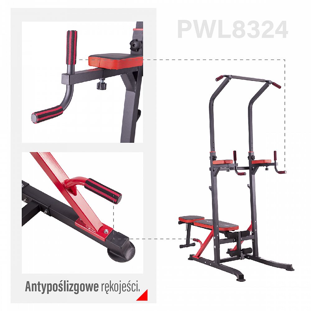 PWL8324 je vyrobená z najkvalitnejších materiálov. Všetky rukoväte sú potiahnuté protišmykovým materiálom, ktorý zaručuje pevný úchop pri cvičení. Hrazdu je možné výškovo nastaviť v rozsahu 200 - 236 cm. Lavička sa dá sklopiť pre úsporu miesta.