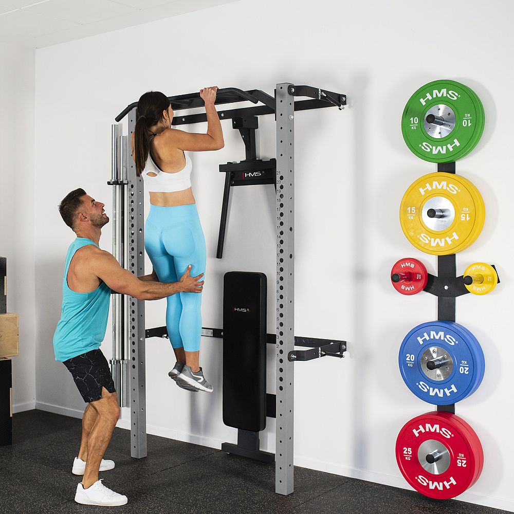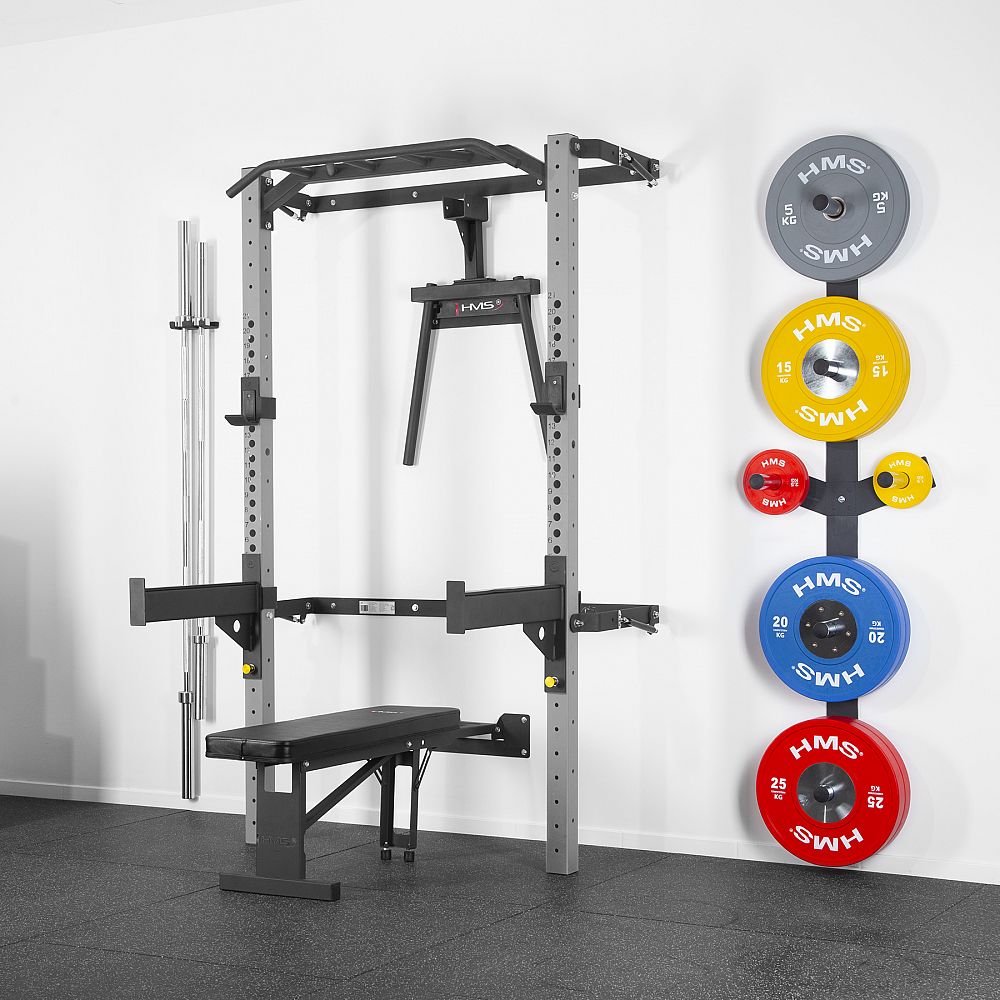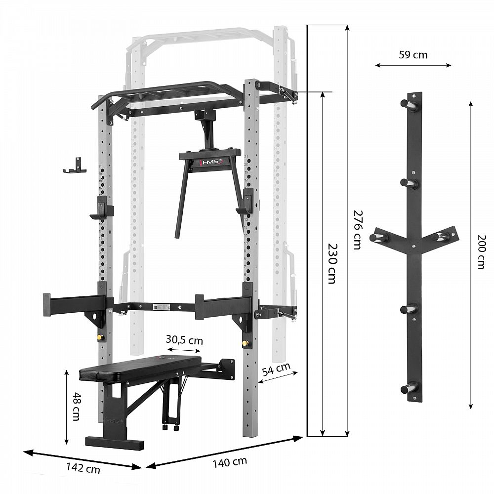 Skladací posilňovací stojan - Power Rack KLT22 od spoločnosti HMS bol navrhnutý tak, aby zodpovedal súčasným trendom na trhu a spĺňal očakávania najnáročnejších zákazníkov. Rack v tejto variante sa predáva s ďalším vybavením. Okrem hrazdy, hákov na činky a bezpečnostných podpier tu nájdete skladaciu rovnú lavicu, adaptér na dipy, nástenný stojan na činky a držiak na osi. Takáto sada rozšíri vaše tréningové možnosti a poskytne vám nové úložné priestory pre vaše vybavenie.