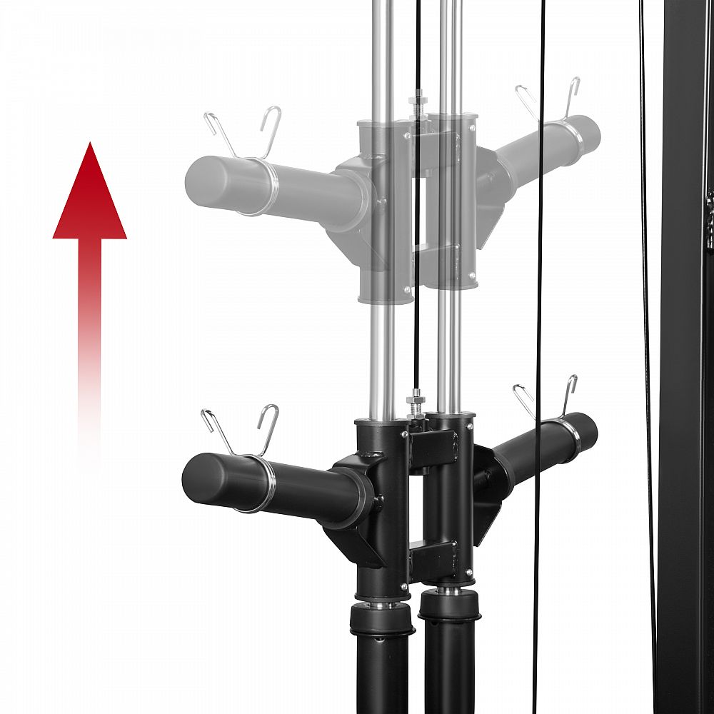 Regulácia prebieha v štyroch polohách. Zarážka stabilizuje telo pri práci na hornej kladke.