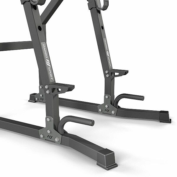 Konštrukcia MS-U110 2.0 je vybavená hákmi, ktoré vám umožnia pohodlne odložiť činku do optimálnej výšky pre práve vykonávaný cvik a zároveň získať lepšiu východiskovú pozíciu pre ďalšiu sériu. Háky je možné nastaviť do 9 úrovní v rozsahu od 51 do 141 cm od zeme. Či už trénujete benchpress, drepy s činkou alebo mŕtve ťahy, budete môcť činku po každom cviku pohodlne odložiť.