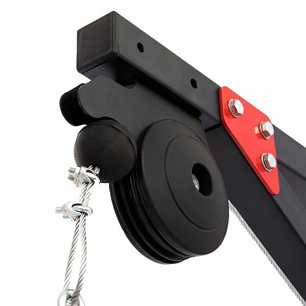 V balení nájdete samotnú konštrukciu kladky, ktorá je vyrobená z oceľového profilu 40 x 40 milimetrov. Oceľové lanko, 2 karabíny, nakladací tŕň s dĺžkou 46 centimetrov a široký adaptér MH-C001. Maximálna nosnosť je 120 kilogramov.