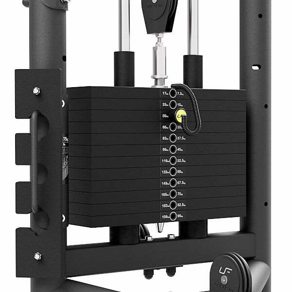 Vrchná kladka UpForm UF-010 je vybavená sadou závaží obsahujúcou 12 tehál s celkovou hmotnosťou 90 kilogramov odstupňovaných po 7,5 kg a jednou doplnkovou tehlou s hmotnosťou 3,75 kilogramov, tá sa umiestňuje nad prvú pevnú tehlu a používa sa na volenie. Volič váhy je opatrený nálepkami pre rýchlu voľbu požadovanej záťaže a istiaci čap je pripevnený na lanku, takže nehrozí jeho strata. Horné rameno sa nachádza vo výške 210 centimetrov, na stroji tak môže pohodlne trénovať ktokoľvek do výšky 200 cm. Všetky kladky sú schované pod kovovými krytmi s logom UpForm. Oceľové lanko je pokryté čiernym PVC, je zakončené masívnym okom a je odpružené gumovým tlmičom.