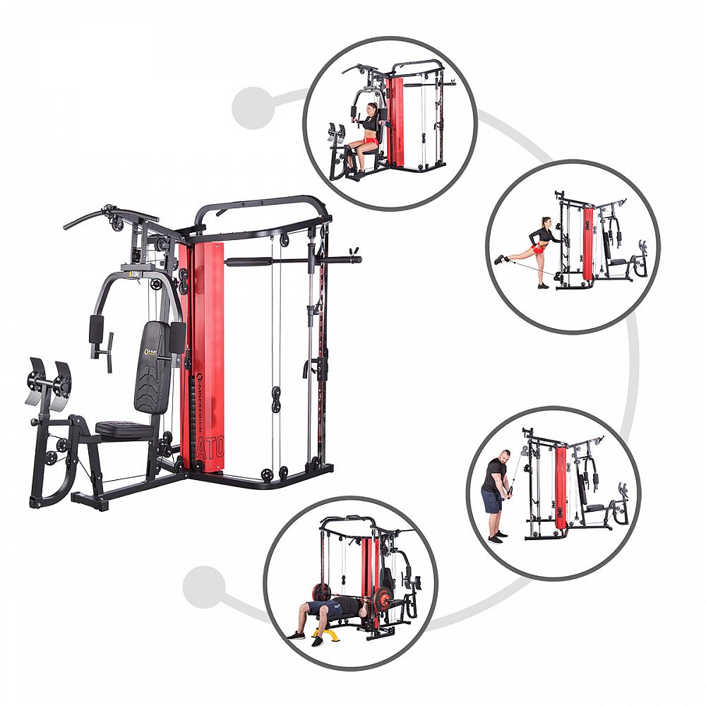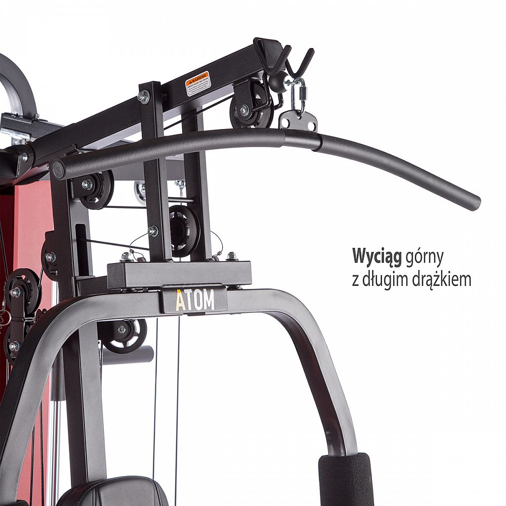 ATOM v sebe snúbi multipress, dve posuvné kladky, rameno na tlaky/motýlika, leg press a hrazdu, takže ide o skutočne komplexný stroj. Súčasťou dodávky je aj dvojité, tricepsové lano, tricepsový adaptér, popruhy ku kladkám a opasok na členok.