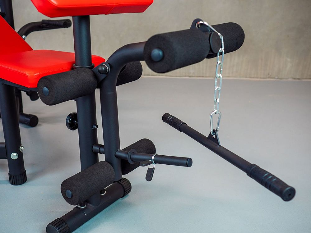 - Na nohy je určená kladka umožňujúca precvičenie stehien a lýtok. Táto kladka umožňuje tiež rozmanité cviky na ruke vďaka retiazkou prepojenému otočnému hriadeľu.