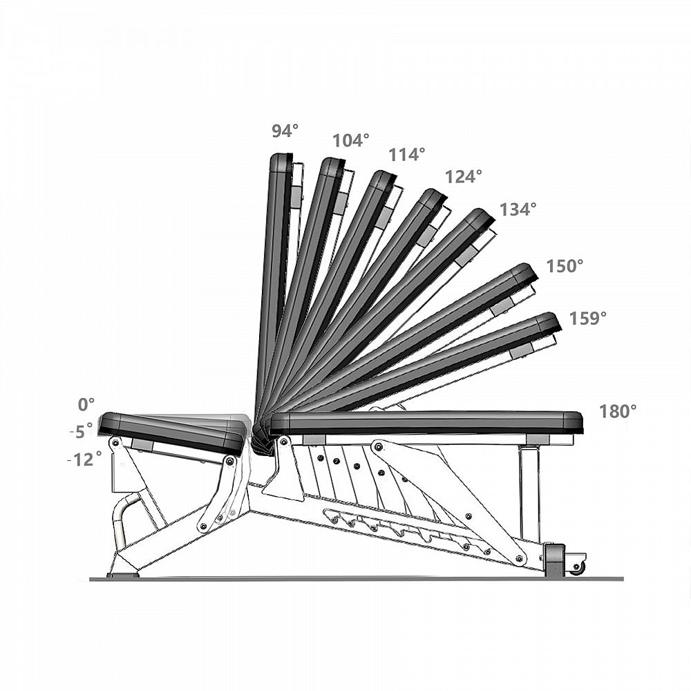 Lavica L1237 ponúka 3 úrovne nastavenia sedadla a 8 úrovní nastavenia operadla. Rozsah uhla operadla je od 94° do 180°, čo umožňuje tréning v rôznych polohách – zvislé, vodorovné aj šikmé. Vďaka tomu môžete efektívne precvičiť rôzne svalové partie, od hrudníka cez chrbát až po ramená, a pritom si zachovať maximálne pohodlie.