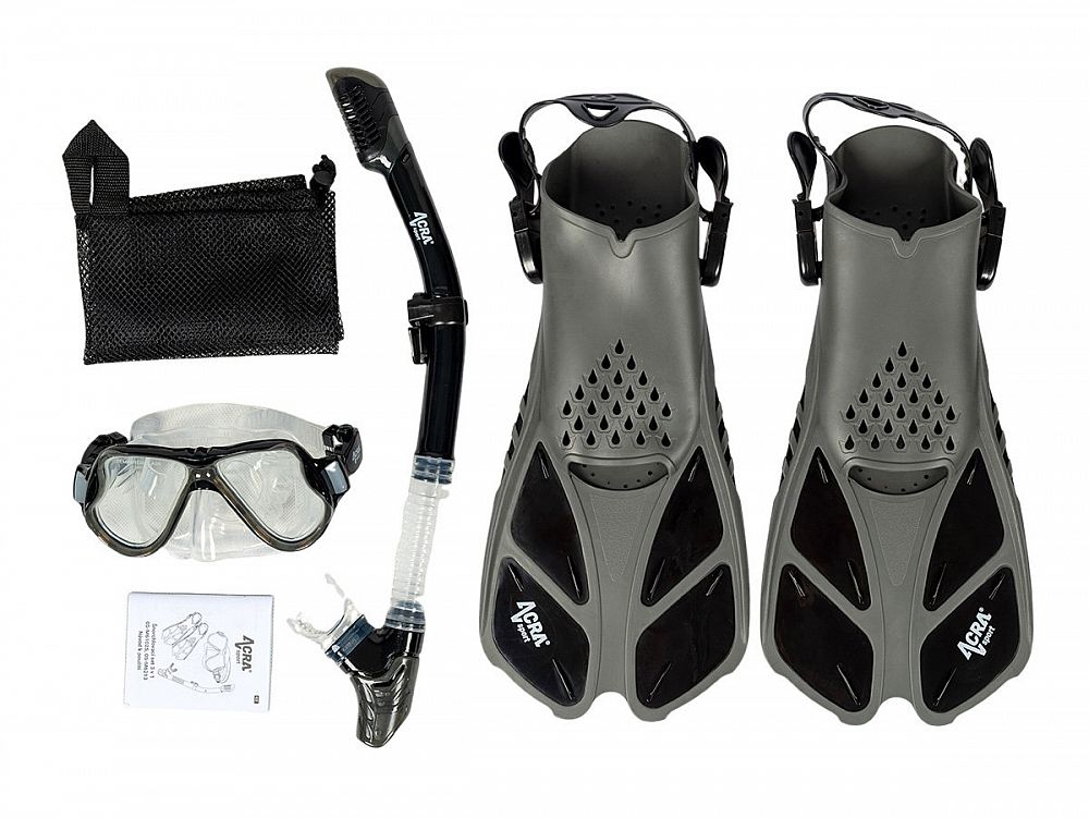 Sada šnorchla Acra Sport s nastaviteľnými plutvami, maska z tvrdeného skla s dvoma priehľadmi, silikónový šnorchel Dry Top a cestovná taška na vybavenie. Šnorchlovací set Acra je dokonalý spoločník na cesty a je vhodný na šnorchlovanie, plávanie, potápanie a mnoho ďalšieho.