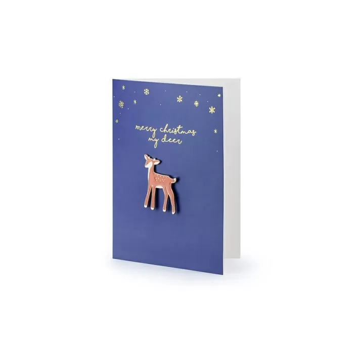 Papierové Vianočné prianie v tmavo modrej farbe so zlatou metalickou potlačou "Merry Christmas My Deer" a so smaltovaným špendlíkom v tvare jeleňa - kolouška.
