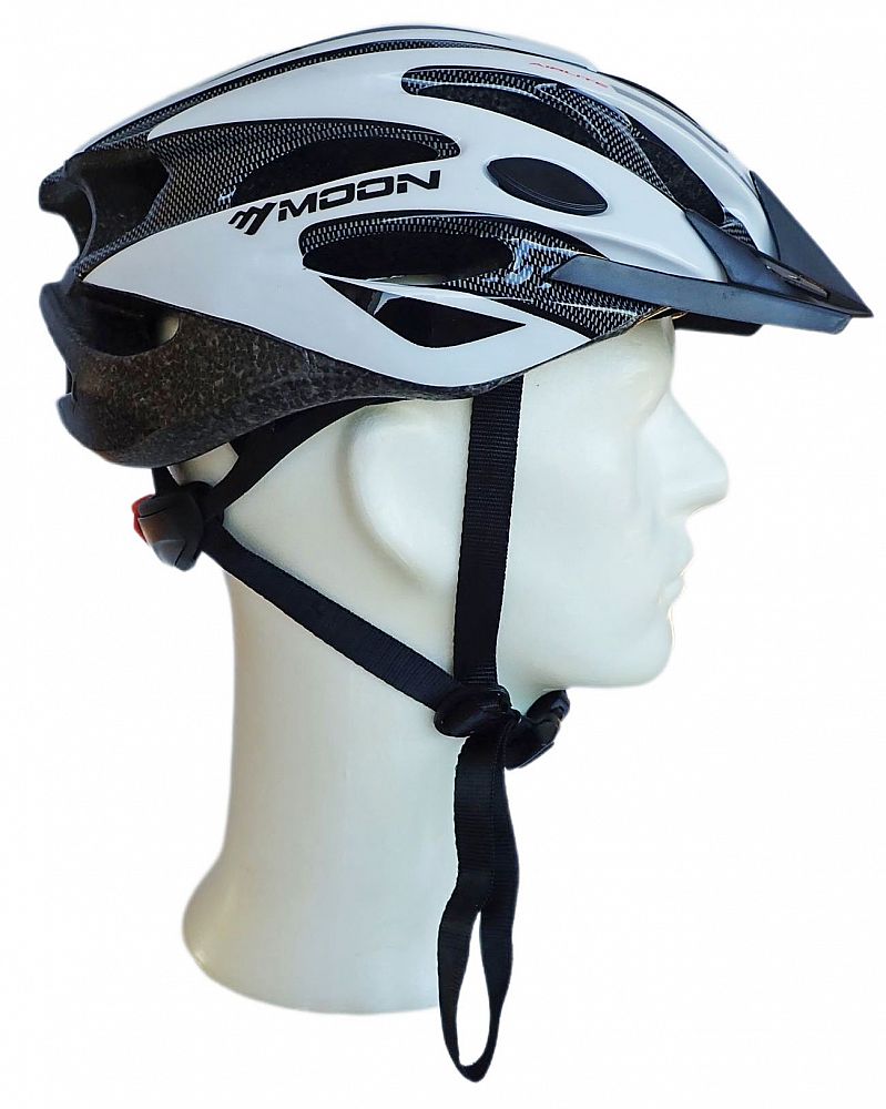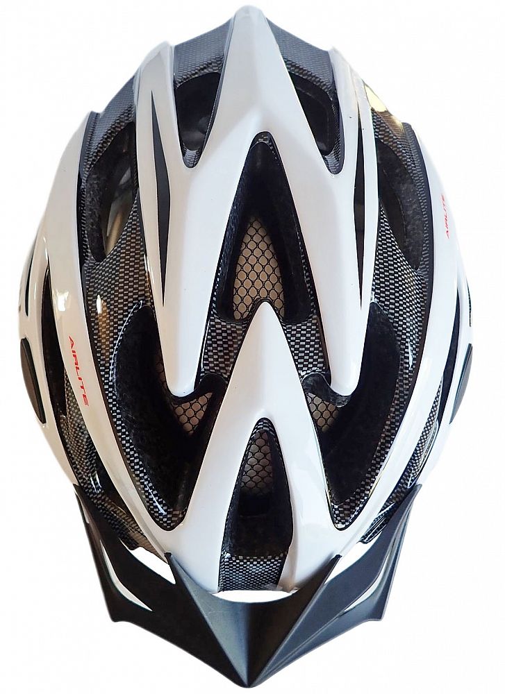 Cyklistická prilba - odľahčená - farba biela, hmotnosť 250 g, 25 vetracích otvorov, sťahovací pásik so skrutkou okolo hlavy pre dokonalé upnutie, demontovateľný cloniaci štítok, sieťku proti hmyzu, veľkosť L (58 - 61 cm). Chladivá mäkká výplň vo vnútri helmy zvyšujúca komfort pre jazdu v teplom počasí.