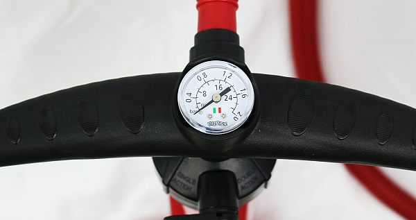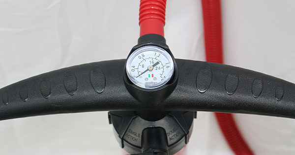 Vlnitá hadica dodávaná s pumpou Bravo je zakončená bajonetovým konektorom špeciálne pre vysokotlakové ventily, ktoré sa často vyskytujú pri nafukovacích SUPoch alebo kajakoch. Na rukoväti je naopak integrovaný praktický tlakomer, takže tlak nafukovania je vždy jasný a nehrozí, že by ste svoje vybavenie nafúkli na nesprávny tlak.