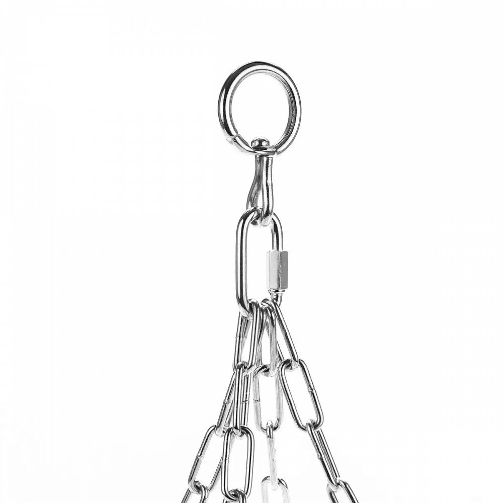 Spolu s vrecom dostanete sadu reťazí a otočné oko, ktoré zabraňuje krúteniu reťazí počas tréningu. Každá jednotlivá reťaz má zvárané články, vďaka čomu je certifikovaná pre zaťaženie 160 kg. Použitie 4 reťazí zaisťuje odolnosť pri zaťažení až 640 kg! Medzi nosné popruhy vrecia a reťaze sú vložené trojuholníkové oká, ktoré na rozdiel od kruhových ôk zaťažujú popruhy rovnomerne.