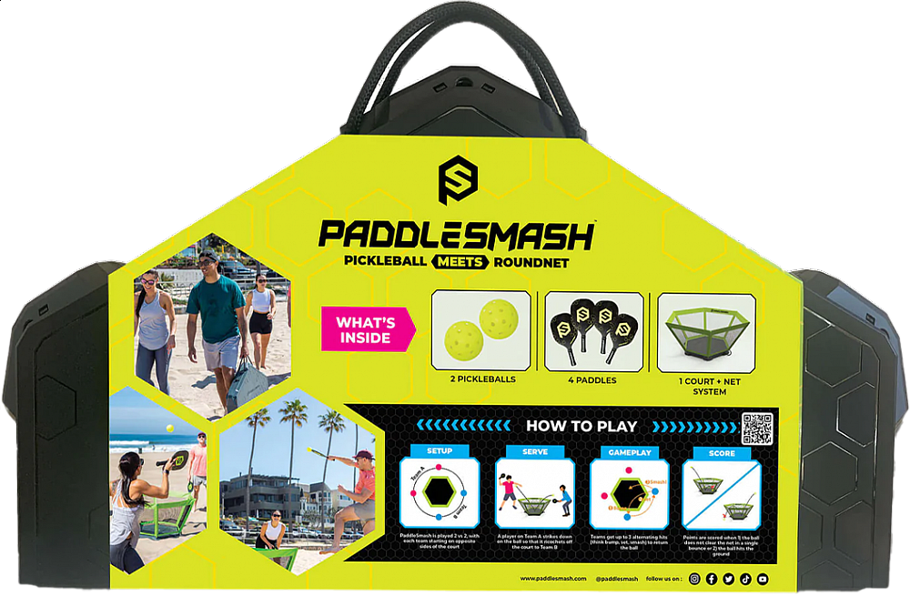 Paddlesmash je inovatívna hra, ktorú je možné hrať v interiéri aj exteriéri. Kombinuje najlepšie prvky pickleballu a spikeballu do zábavnej a ľahko naučiteľnej hry, ktorú si môžete užiť kdekoľvek. Hra je navyše vysoko prenosná, pretože herná základňa sa dá zložiť a sieťový systém sa do nej úhľadne zmestí. Dohromady tvorí pevný kufrík, v ktorom je možné pálky a loptičky pohodlne skladovať a prenášať.