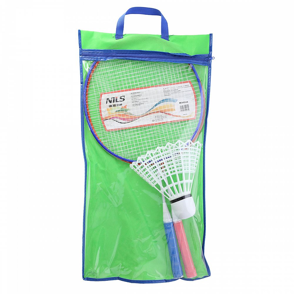 Juniorská badmintovová sada NILS NR302. Sada obsahuje 2 rakety, 1x letku a sieťovaný obal.