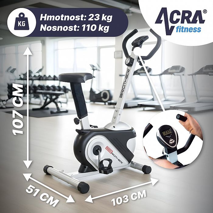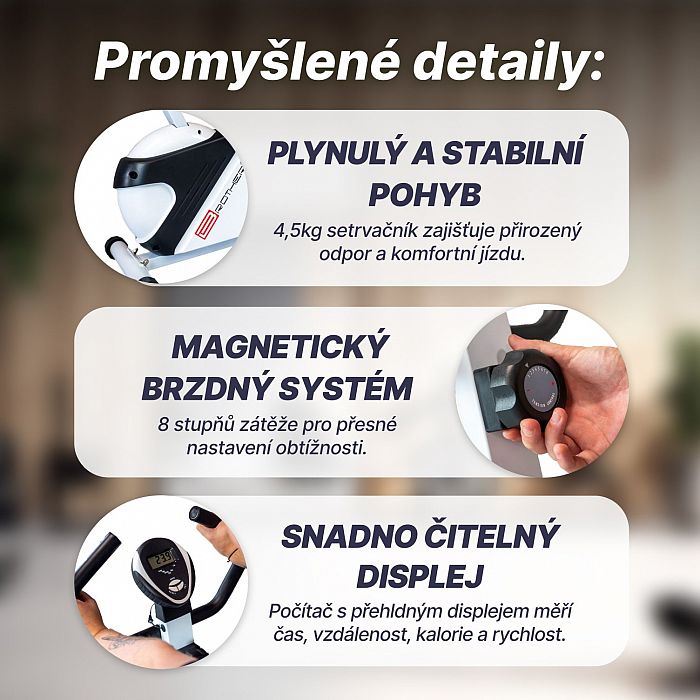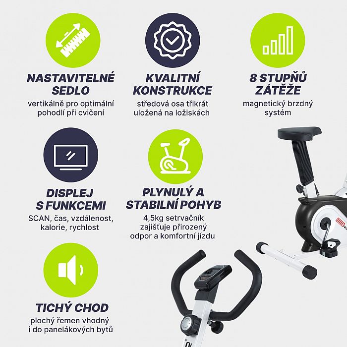 - magnetická brzda s ôsmimi stupňami záťaže, váha zotrvačníkového kolesá 4,5 kg, vertikálne nastaviteľné sedlo, prevod plochým remeňom