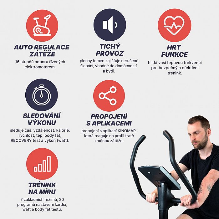 - Možnosť použitia aplikácií napojených cez tablet alebo mobilný telefón. Odporúčame použitie aplikácií KINOMAP, ktoré ponúkajú širokú škálu použitia s možnosťou platených rozšírených funkcií podľa vlastného priania.