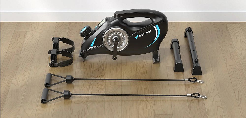 - Cvičenie celého tela– Posilňuje paže aj nohy pomocou odporových gúm a pohybu podobného jazde na bicykli pre efektívny tréning celého tela.