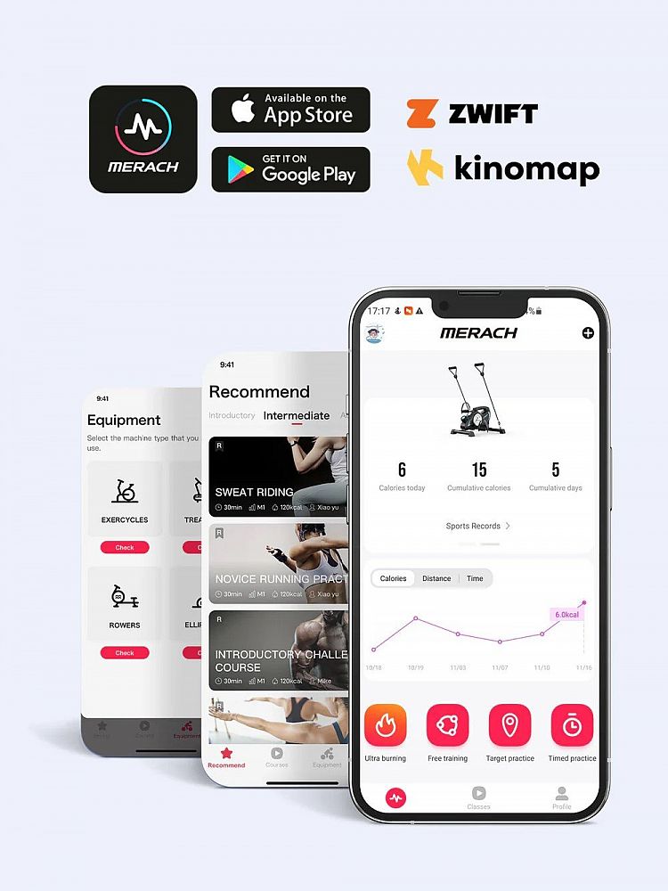 - Inteligentné sledovanie a tréningy so sprievodcom - Disponuje LCD displejom a bezplatnou aplikáciou MERACH pre sledovanie údajov v reálnom čase a časované tréningy.