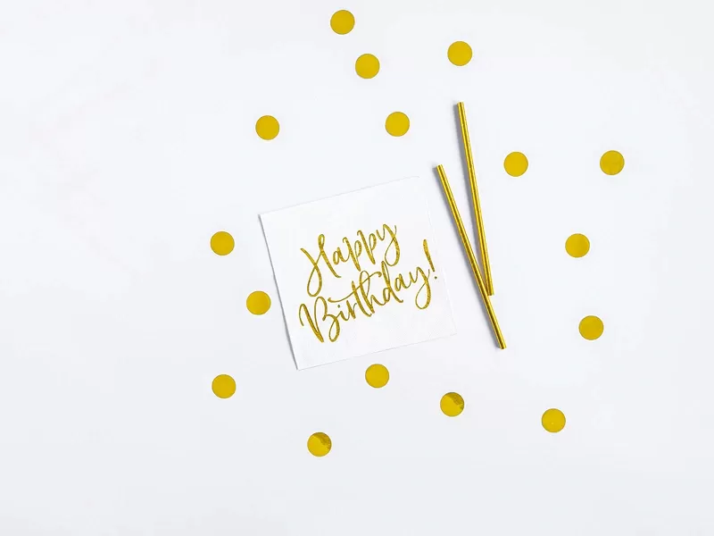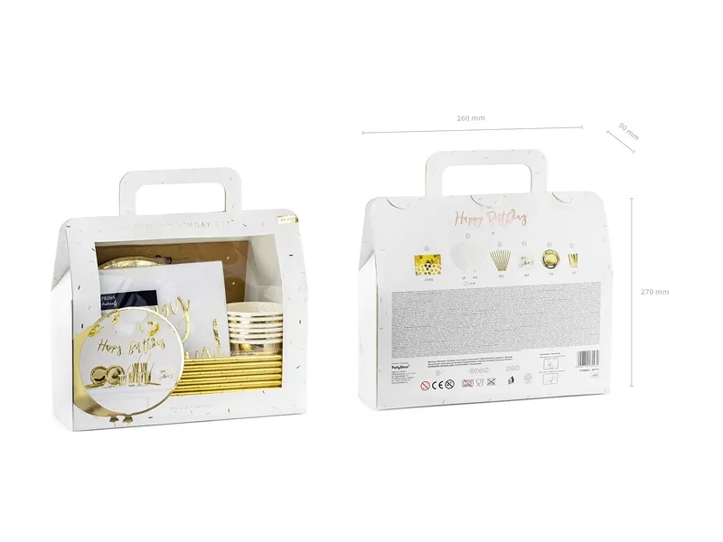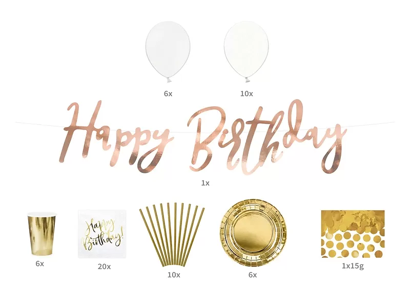 Set obsahuje: papierovú girlandu 1ks, latexové balóniky v mixe dizajnov 16ks, zlaté tégliky 6ks, papierové obrúsky s potlačou 20ks, slamky 10ks, zlaté taniere 6ks a zlaté konfety (15g).