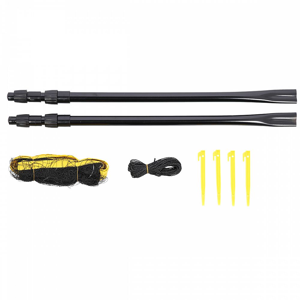 Sada sa skladá z 2 teleskopických stĺpikov, siete s rozmermi 6,3 x 0,6 metra a 2 napínacích šnúr. Všetko je zabalené v praktickom obale s uchom na prenášanie.