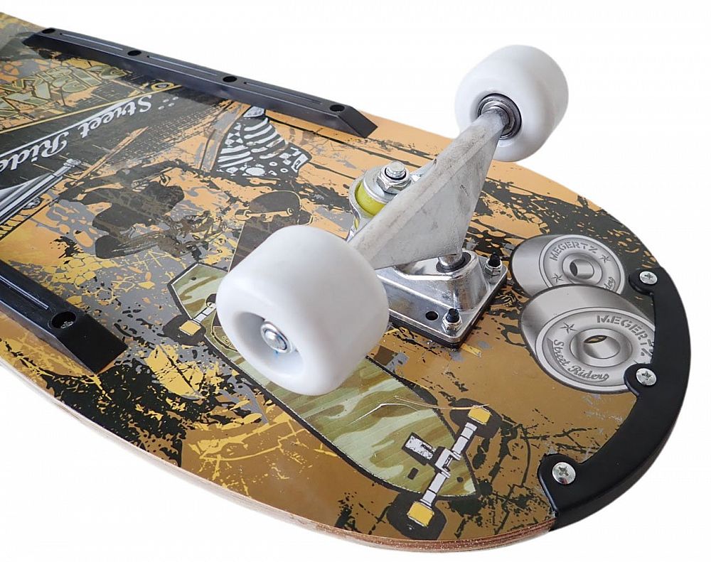 - vhodný pre rekreačných jazdcov vzhľadom k doske - 77 x 25,5 cm a širšiemu Alu podvozku - 15,5 cm oproti závodným skateboardom, ktoré majú podvozok 12,5 cm a užšiu dosku okolo 20 cm šírky