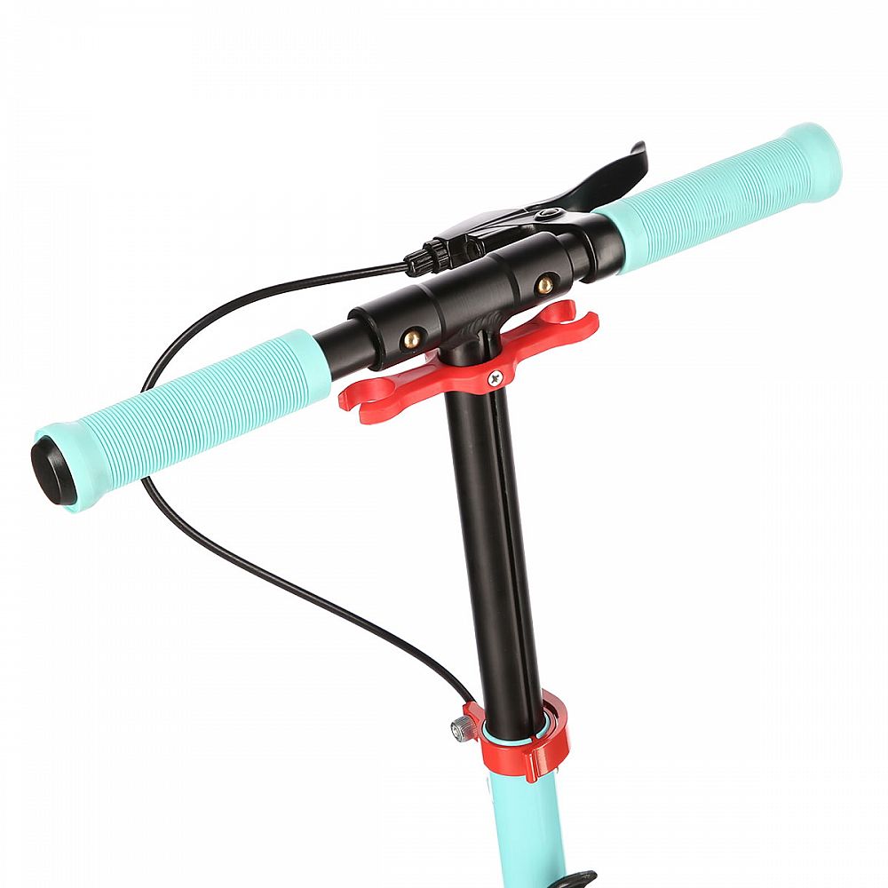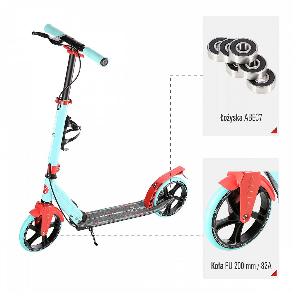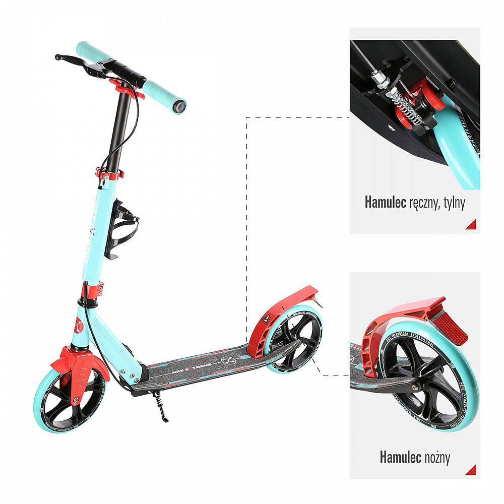 Zadný blatník slúži ako prítlačná brzda, ktorá ešte podčiarkuje brzdný účinok mechanickej brzdy ovládanej lankom z páčky na riadidlách , tie sú opatrené gumovými rukoväťami, ktoré zaisťujú pevný a pohodlný úchop. Veľké kolesá sú osadené ložiskami ABEC 7 a polyuretánovou pneumatikou s priemerom 200 milimetrov. Táto kombinácia zaisťuje rýchlu, plynulú a bezpečnú jazdu. Na stĺpiku riadidiel má svoje miesto držiak na odloženie fľaše s nápojom, ktorý nájde svoje využitie pri dlhších vychádzkach. Blatník na prednom kolese využijete, pokiaľ Vás zastihne dažďová prehánka.