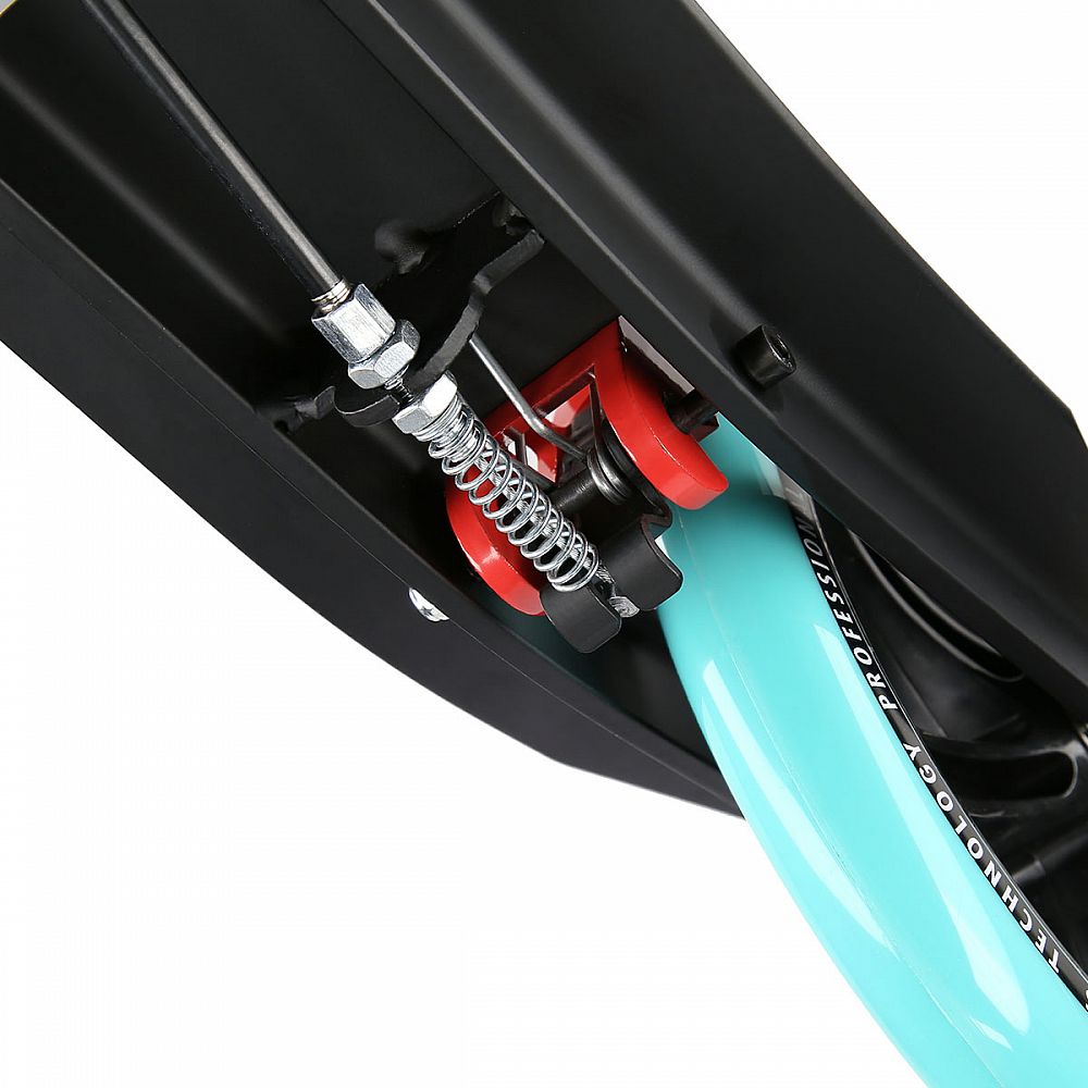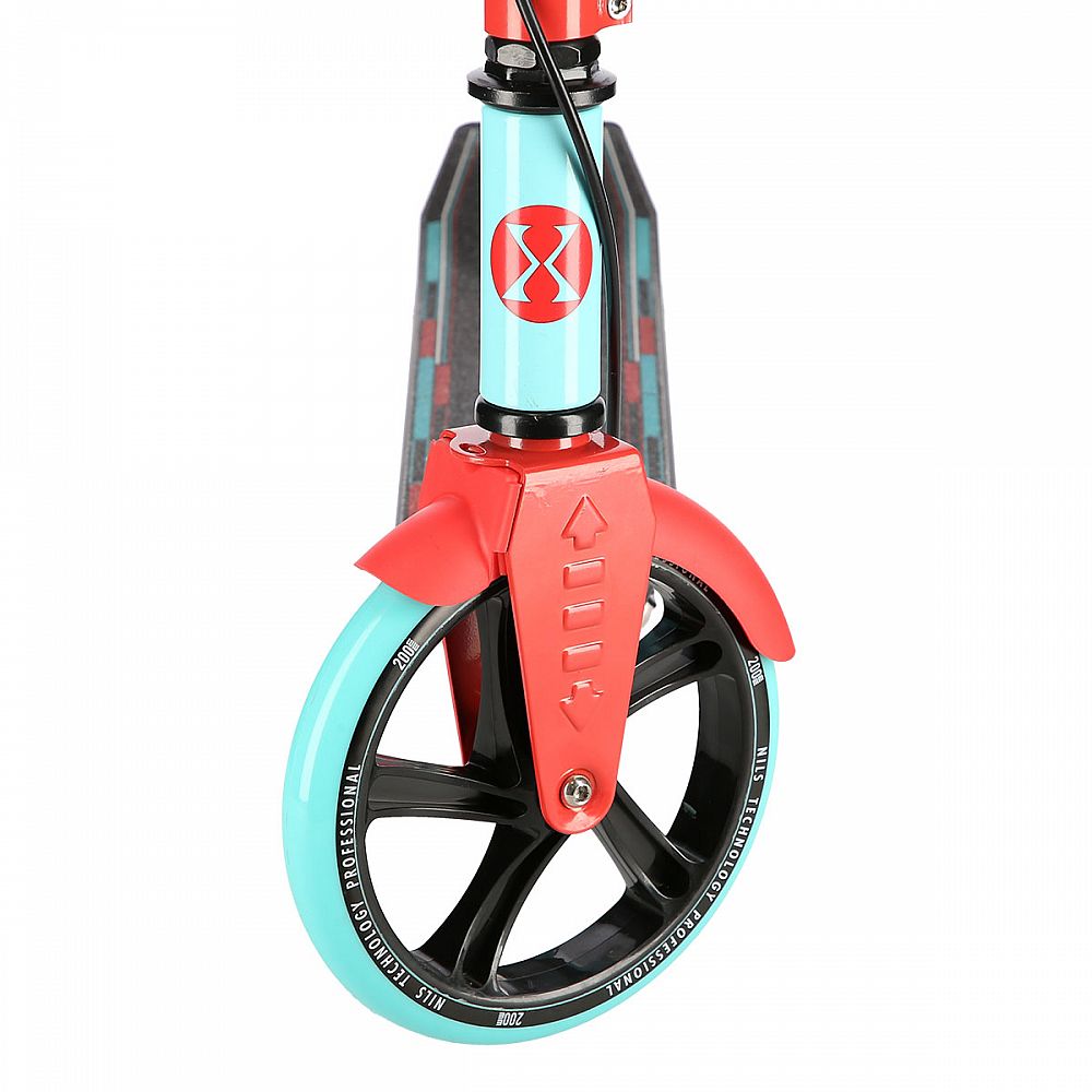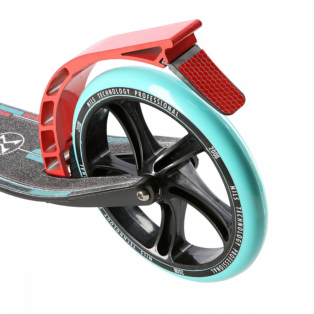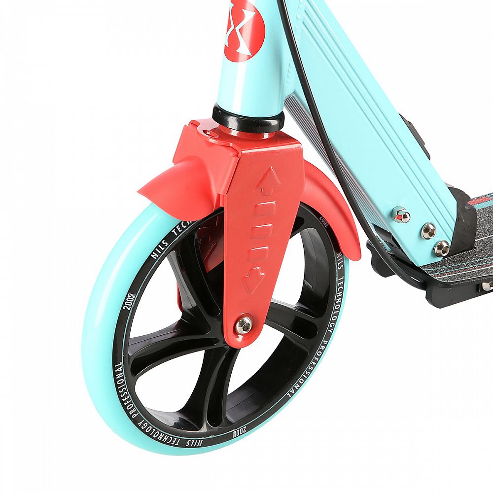 Zadný blatník slúži ako prítlačná brzda, ktorá ešte podčiarkuje brzdný účinok mechanickej brzdy ovládanej lankom z páčky na riadidlách , tie sú opatrené gumovými rukoväťami, ktoré zaisťujú pevný a pohodlný úchop. Veľké kolesá sú osadené ložiskami ABEC 7 a polyuretánovou pneumatikou s priemerom 200 milimetrov. Táto kombinácia zaisťuje rýchlu, plynulú a bezpečnú jazdu. Na stĺpiku riadidiel má svoje miesto držiak na odloženie fľaše s nápojom, ktorý nájde svoje využitie pri dlhších vychádzkach. Blatník na prednom kolese využijete, pokiaľ Vás zastihne dažďová prehánka.