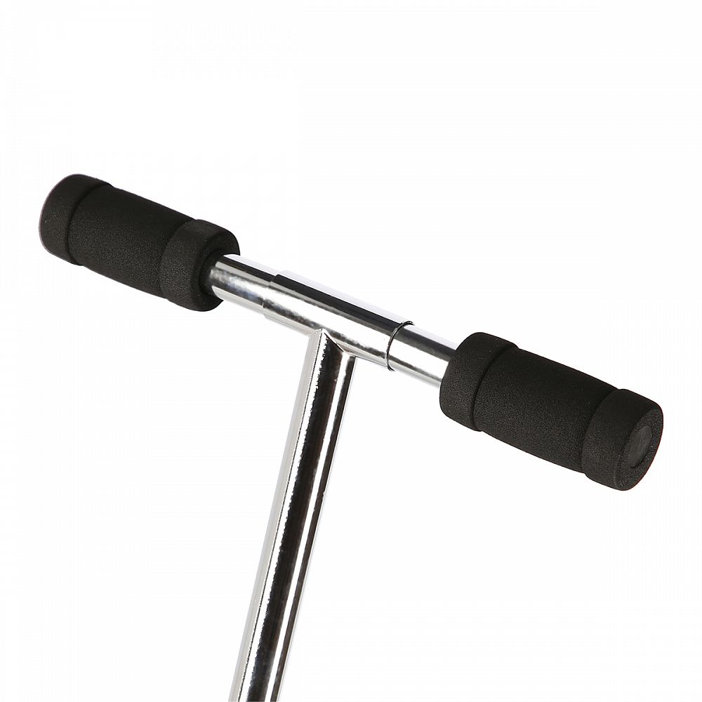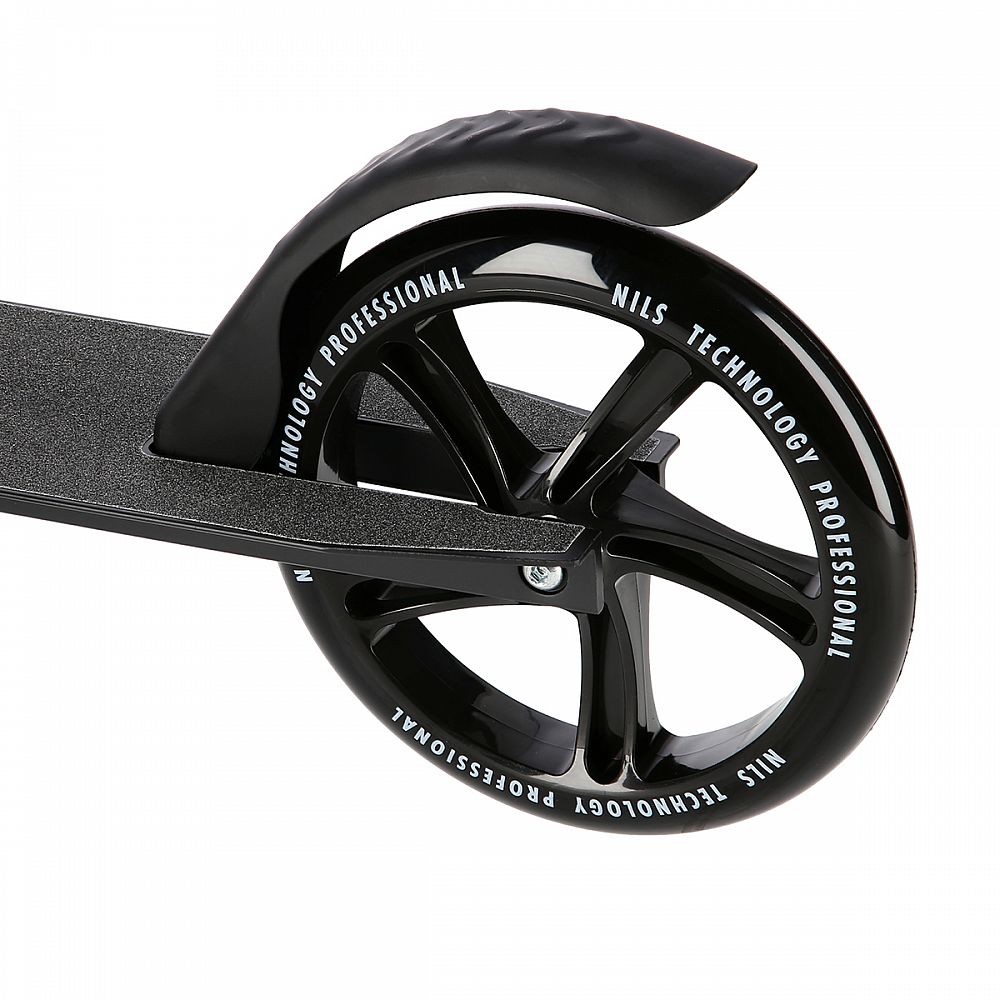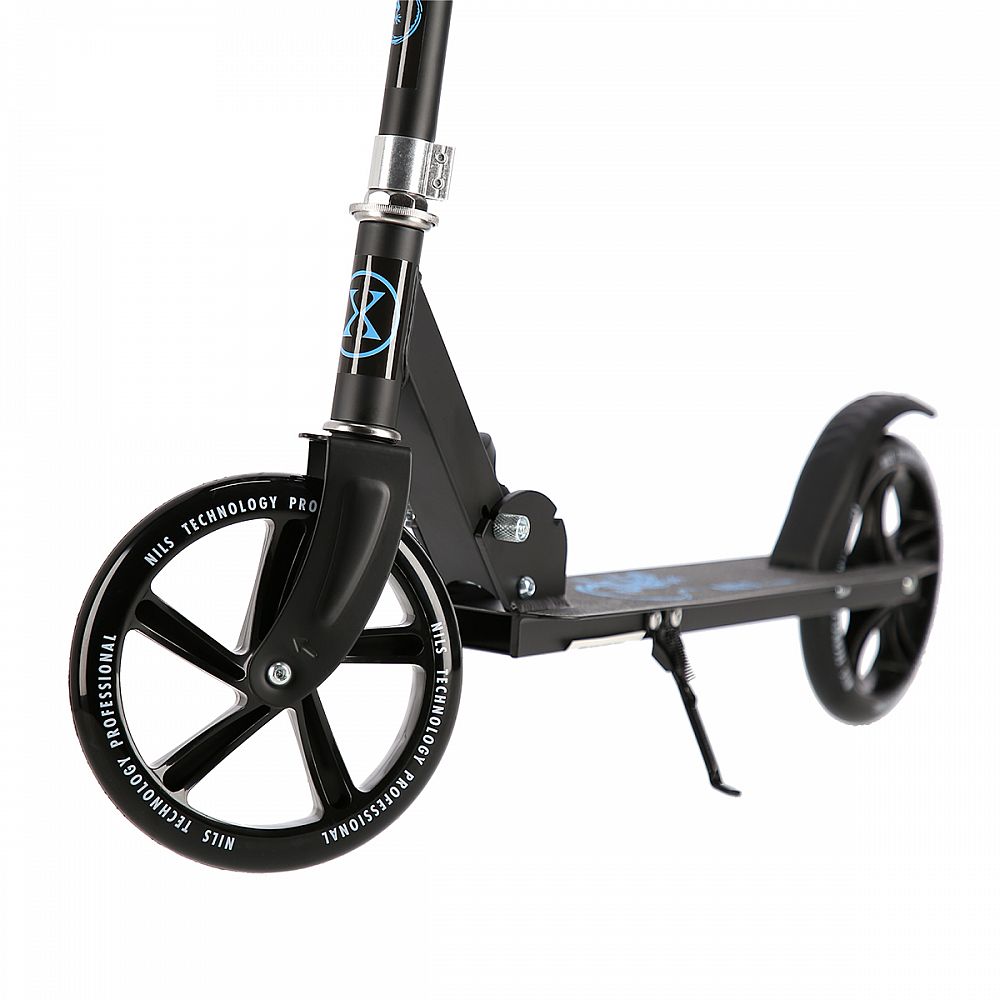 Zadný blatník slúži ako nášľapná brzda. Sklopné riadidlá sú opatrené penovými rukoväťami, ktoré zaisťujú pevný a pohodlný úchop. Riadidlá sú výškovo nastaviteľné do 3 úrovní. Veľké kolesá sú osadené ložiskami ABEC 7 a polyuretánovou pneumatikou s priemerom 200 milimetrov. Táto kombinácia zaisťuje rýchlu, plynulú a bezpečnú jazdu. Sklopný stojan umožňuje postavenie kolobežky, takže ju nie je potrebné pokladať.