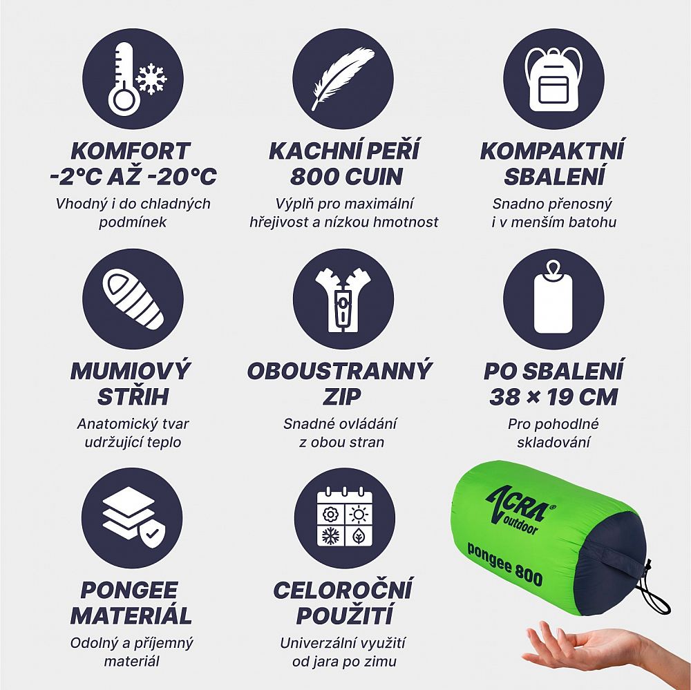Acra Pongee 800 je skvelý spací vak pre všetkých, ktorí si chcú užiť komfortný spánok v prírode aj v tých najnáročnejších podmienkach. Vďaka svojmu múmiovému strihu, kvalitnej izolácii z kačacieho peria a kompaktnej veľkosti je ideálny pre kempovanie, turistiku a horolezectvo.