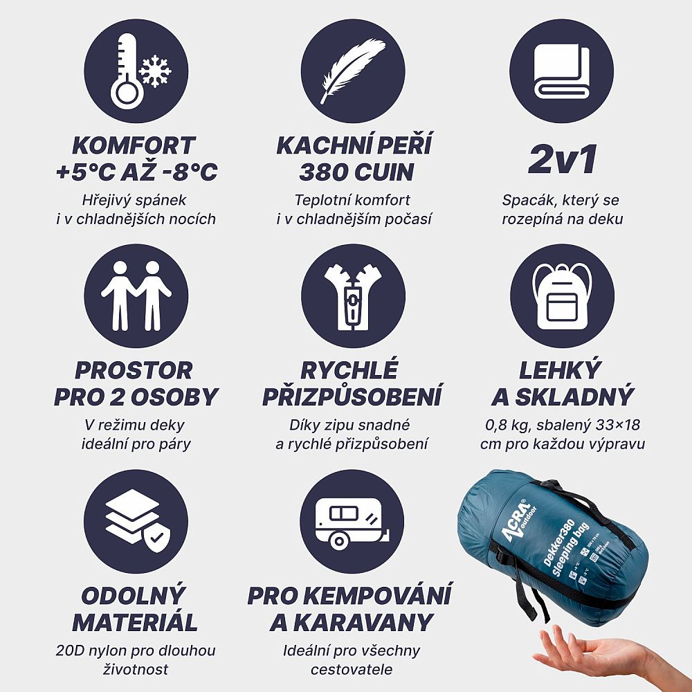 ACRA Dekker380 Perový Spací Vak 2v1: Maximálny komfort a flexibilita pre váš camping a karavaning!