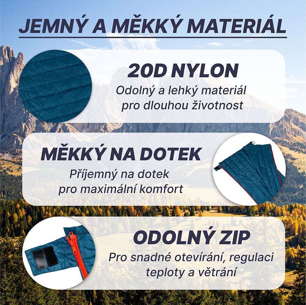 Odolný a príjemný materiál: Vonkajšia aj vnútorná látka je vyrobená z ľahkého a jemného 20D Nylonu, ktorý je zároveň dostatočne odolný pre bežné používanie v kempe a príjemný na dotyk.