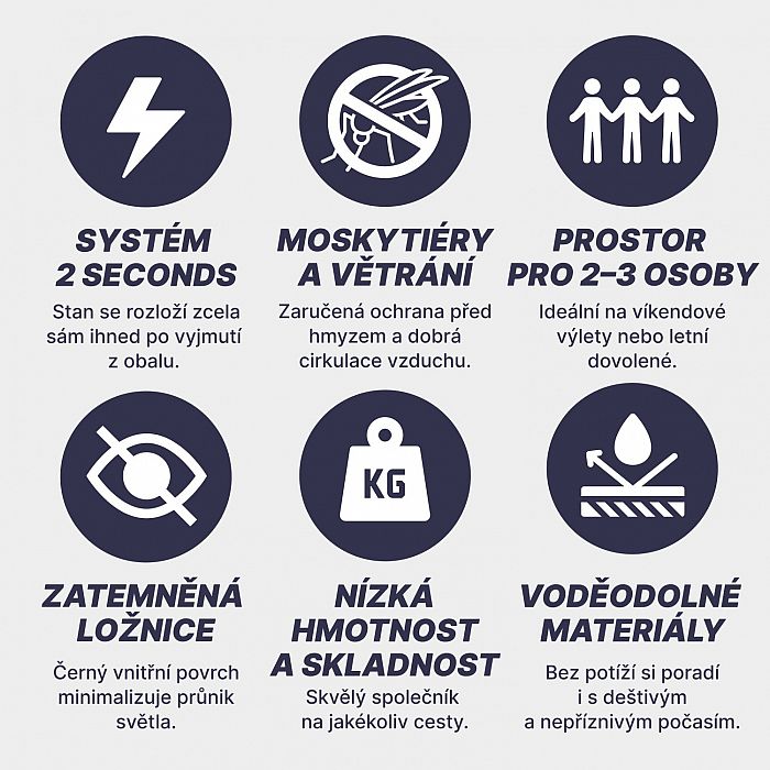- 2 Seconds systém: Vďaka navlečeným sklolaminátovým tyčiam sa stan automaticky postaví po vybratí z obalu. Postavenie trvá iba 2 minúty, takže si ho môžete užiť aj v tých najnáročnejších podmienkach.
