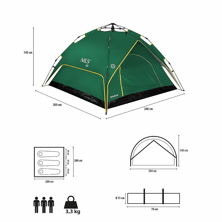 NILS Camp NC7819 Shadow je 3 osobový stan, ktorý oceníte pri potulkách prírodou, spaní pod "šírákom" alebo pri krátkom pobyte v kempe. Odnímateľné tropiko je možné využiť ako prístrešok, ktorý vás ochráni pred dažďom alebo slnkom. Automatická skladacia konštrukcia zaisťuje rýchle zloženie a rozloženie stanu.