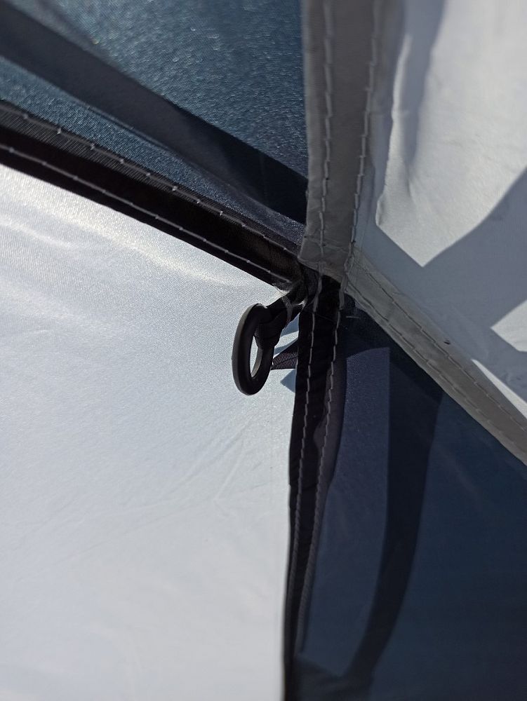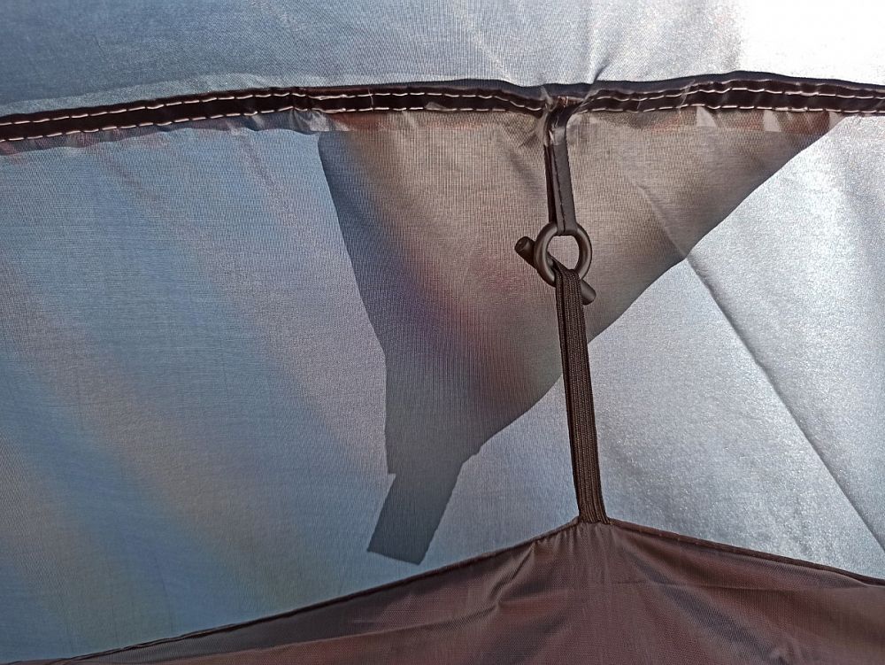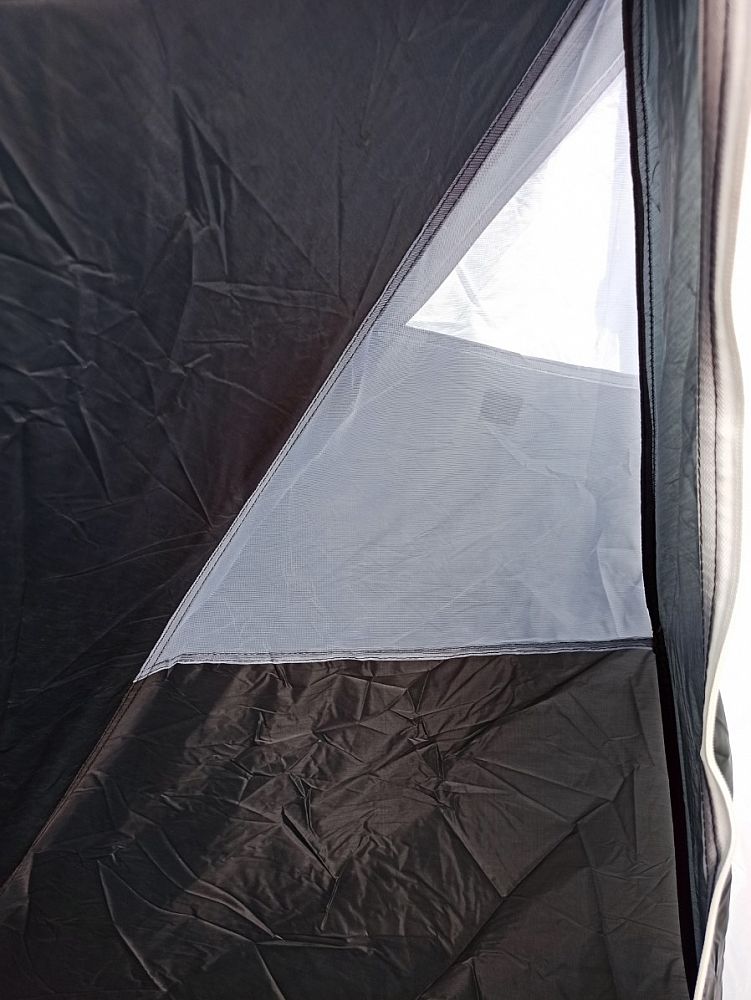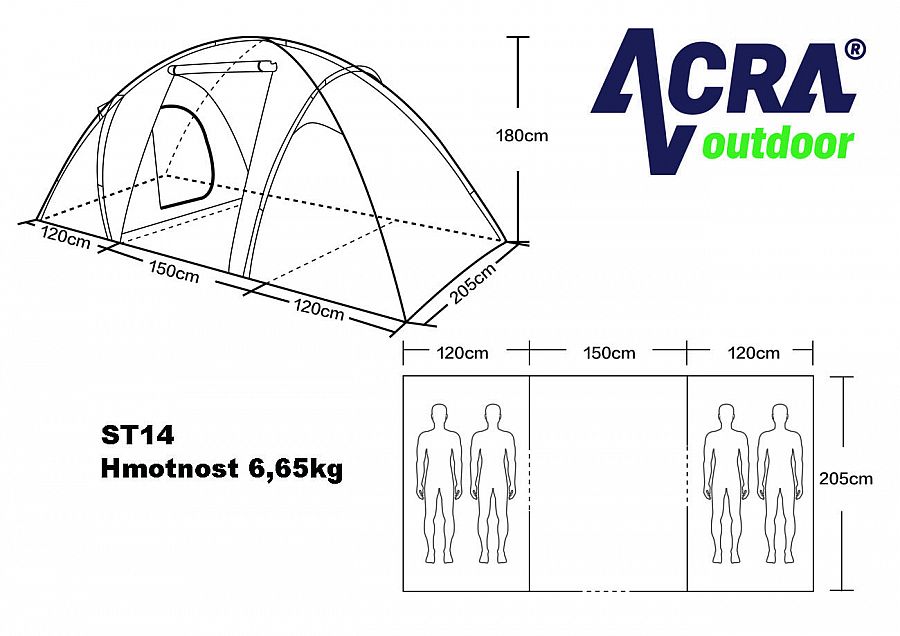 - (120+150+120 cm - šírka stanu - obe spálne + predsieň) x 205 cm (hĺbka stanu) x 180/135 cm (výška stanu v predsieni, nižšia výška je pre priestor nad spálňami), dve spálne, prístrešok nad vchodom