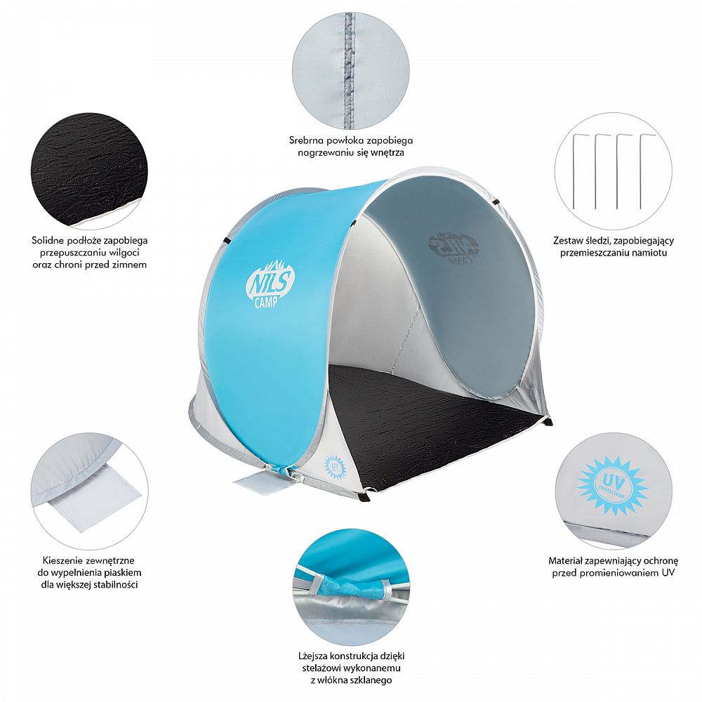 Popis: Samorozkladací plážový stan NILS Camp NC3173 modro-sivý