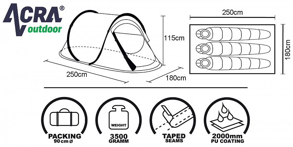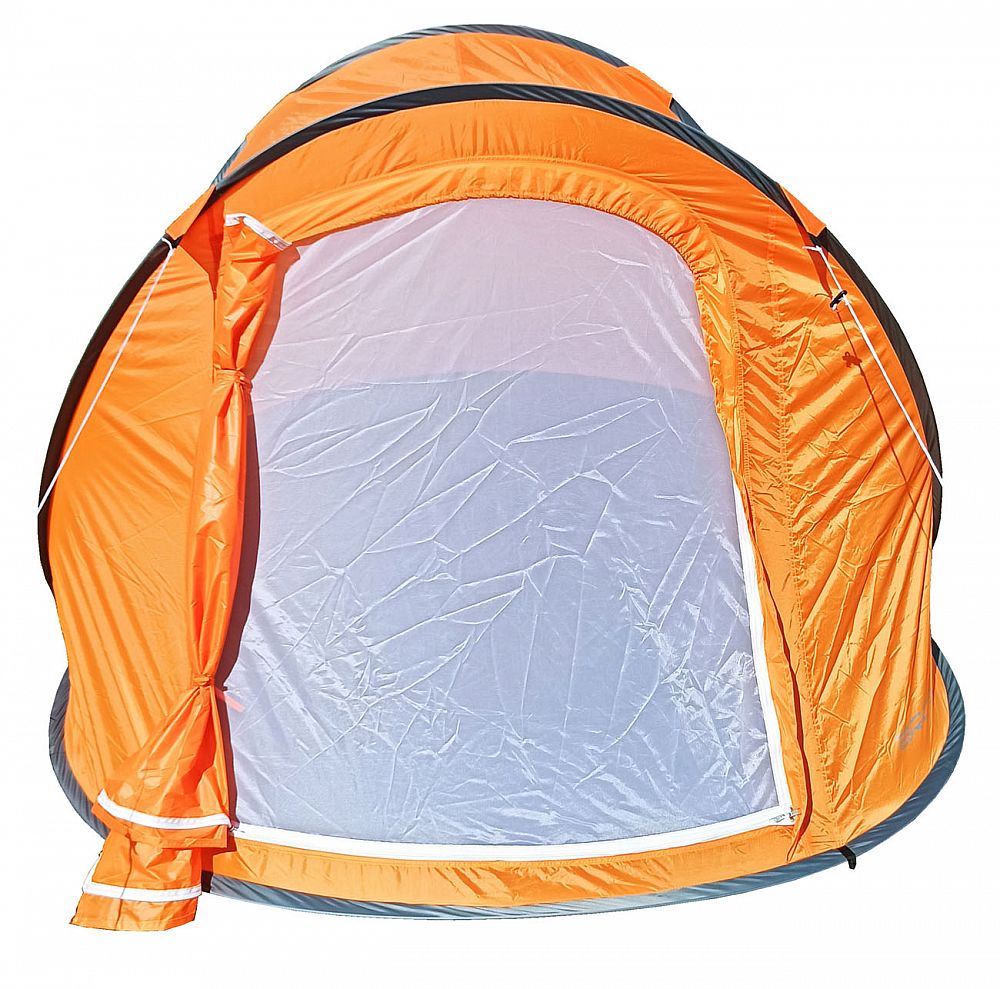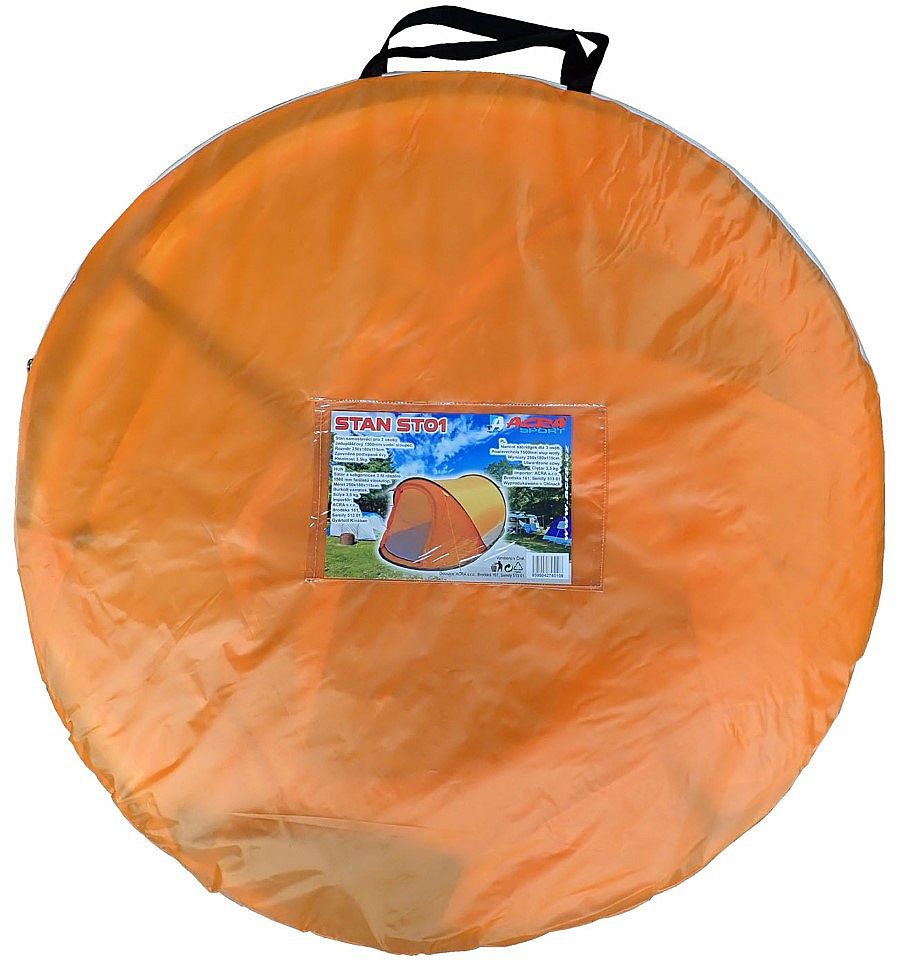 Samostavací stan má spevnené a podlepené švy, ktoré bránia preniknutiu vody, impregnácia je 1500 mm vodného stĺpca, hmotnosť stanu je 3,5 kg. Zbalený stan zaberie minimum priestoru. Stan stačí vybrať z obalu, hodiť na zem a on sa sám postaví vďaka pružným sklolaminátovým nosným prútom. Pri stane je pribalené návod s postupom na skladanie a rozkladanie stanu. Rozmer na prepravu 90 x 90 x 3 cm.