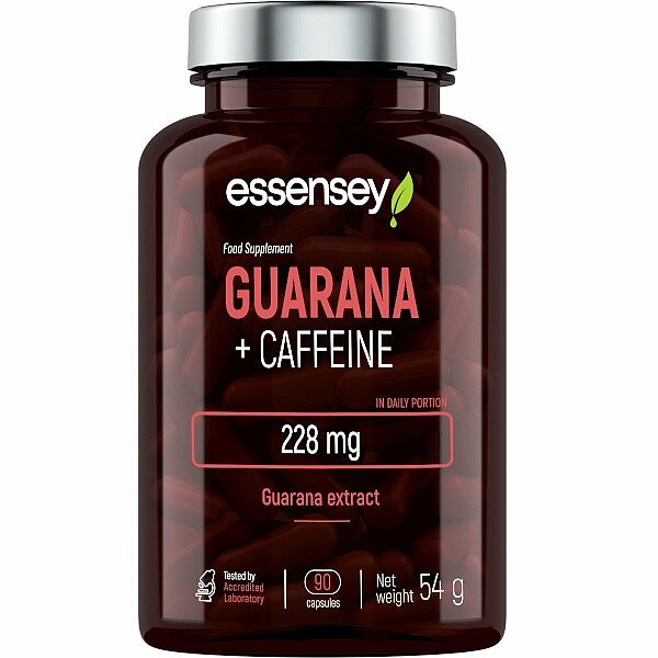 ESSENSEY GUARANA + CAFFEINE. Výživový doplnok. Obsahuje kofeín; neodporúča sa pre deti a tehotné ženy (200 mg na dennú dávku). Výrobok v kapsuliach s obsahom extraktu zo semien guarany (Paullinia cupana) a kofeínu.