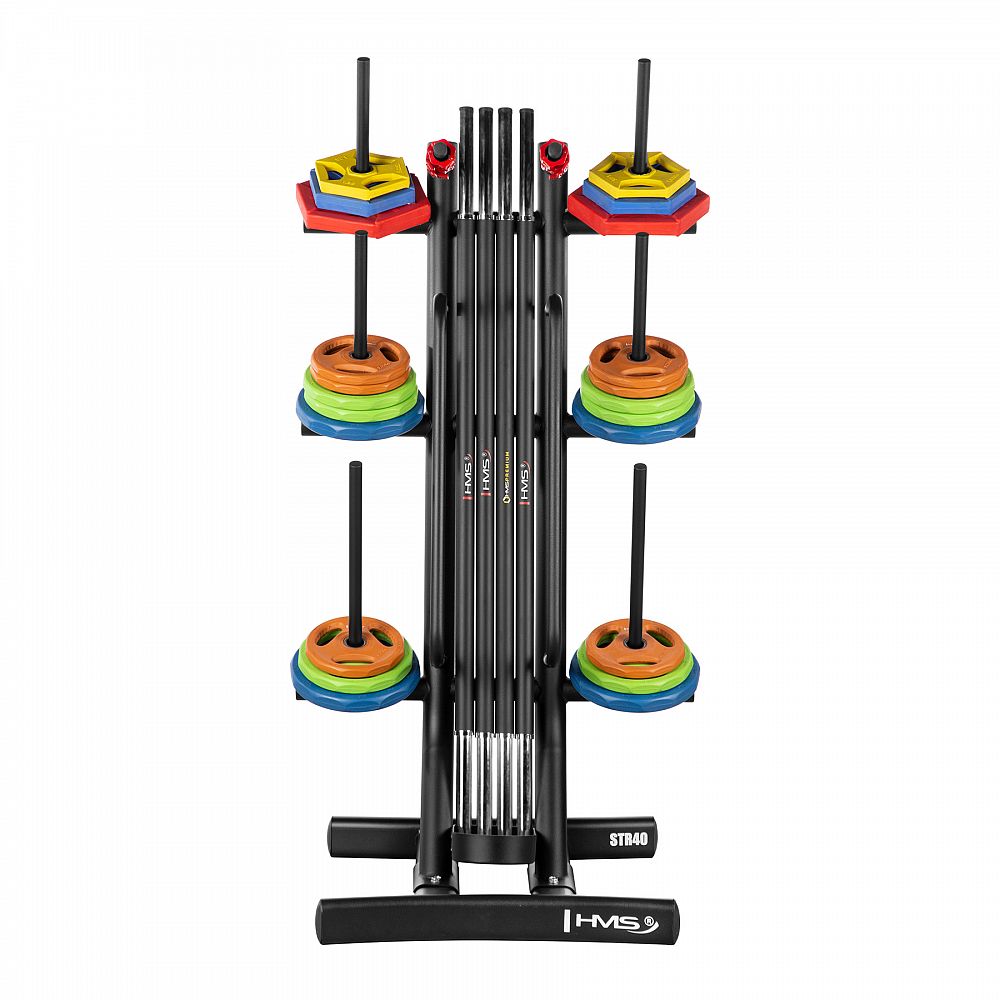 STR40 je funkčný tréningový stojan, ktorý pomáha s organizáciou priestoru uložením kotúčov, osí a príslušenstva pre tréning Body Pump. Vďaka maximálnej nosnosti 280 kg a premyslenej konštrukcii je ideálnou voľbou pre fitness centrá aj domáce posilňovne.