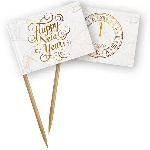 Napichovátka na oslavu nového roka s nápisom happy new year a hodinami, vďaka ktorým budete mať do tematickej párty ozdobený aj tanier s jednohubkami.