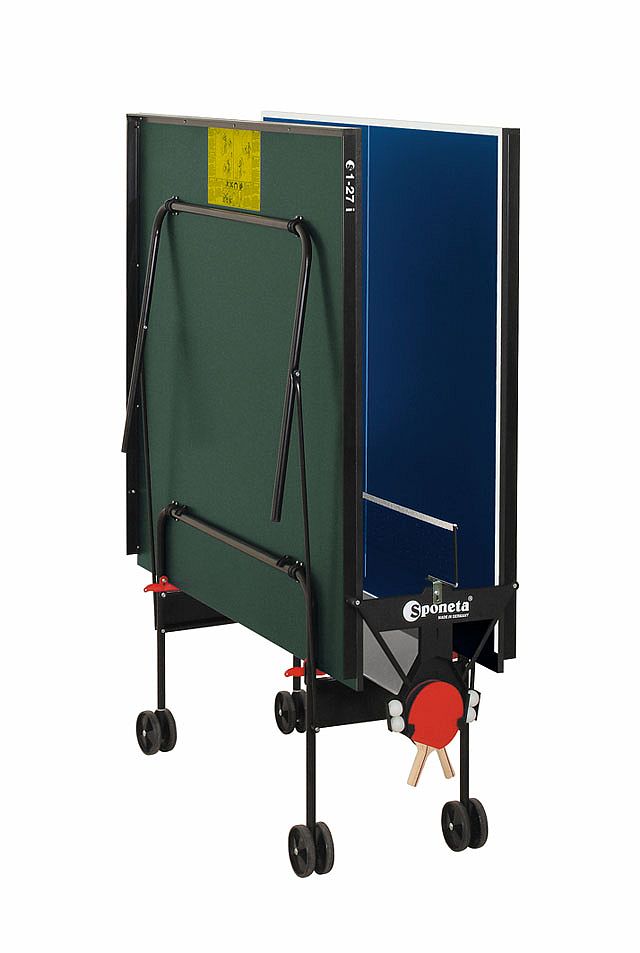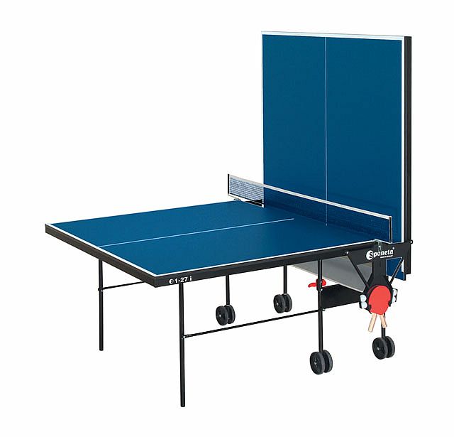 Stôl na stolný tenis Sponeta S1-27 aj s pojazdom, sieťka, držiak na sieťku je súčasťou vybavenia stola. Stôl je natoľko kvalitný, že naň poskytujeme predĺženú záruku na 3 roky. Rekreačný stôl, so spevnenou doskou, 16 mm hrubou doskou a kovovým rámom pod doskou o profile 36 mm na vystuženie stola. Zodpovedá novej európskej bezpečnostnej norme. Rozmery stola 274 x152,5 x 76 cm v rozloženom stave, celková výška v zloženom stave určenom na manipuláciu je 153 (184 cm vrátane ponechaných držiakov na sieťku) x 65 cm x 189 cm vrátane výšky koliesok. Rozmery v manipulačnom stave - v kartóne sú 162 x 140 x 11 cm. Stôl má hmotnosť 66 kg a je možné ho ľahko zložiť bez nutnosti demontovať držiak na sieťku so sieťkou. Súčasťou výrobku je držiak na sieťku a sieťka. Stôl je určený na rekreačné účely a na vnútorné použitie. Pod stolom je držiak na rakety a loptičky. Dodávame vo farbe MODRÉ. Hmotnosť zabaleného stola je 70 kg. Doprava je zahrnutá v cene výrobku.