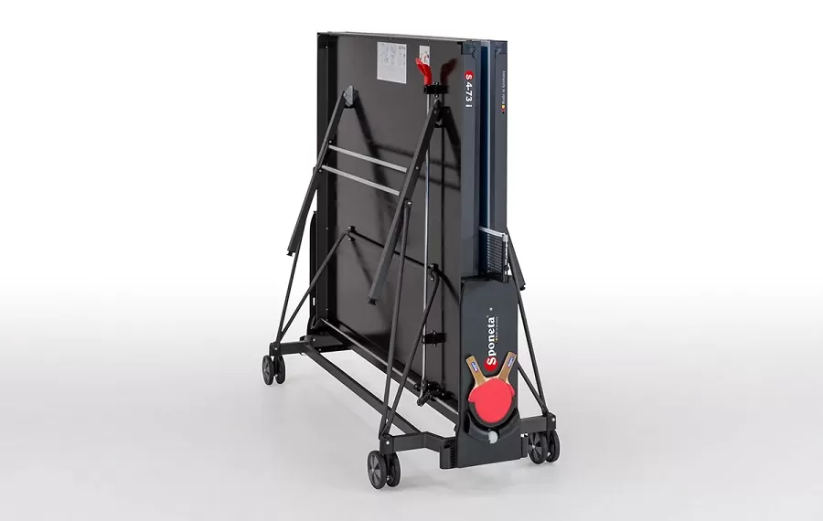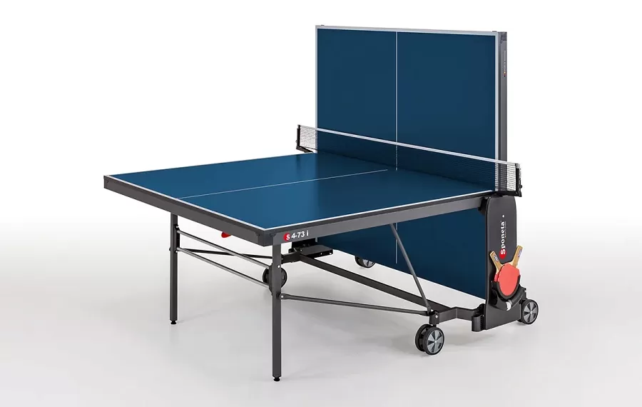 Pingpongový stôl Sponeta S4-73i je kvalitný stôl určený na športové účely, prípadne pre náročnejších rekreačných hráčov. Stôl je natoľko kvalitný, že naň poskytujeme predĺženú záruku na 3 roky. Výhodou tohto stola je možnosť lepšej stability pre presuny zbaleného stola v manipulačnej polohe - dosky sú tesne pri sebe a sú na konštrukcii uložené 10 cm nad zemou. Stôl je určený na vnútorné použitie. Má brúsený povrch na 19 mm hrubej doske. Táto doska už zaručuje stále vlastnosti pre rekreačnú hru na vyššej úrovni. Doska je navyše ešte vystužená oceľovým rámom 50 mm, ktorý stôl ešte ďalej spevňuje. Nohy stola sú oceľové. Stôl je vystužený do troch strán kovovými tiahlami. Vnútorná časť stola je opatrená štyrmi kolieskami na uľahčenie manipulácie v zloženom stave - dve kolieska sú otočné. Uprostred stola je držiak na rakety a na loptičky. Kvalitná sieťka a kvalitný držiak na sieťku je súčasťou vybavenia stola. Rozkladanie a skladanie stola je ovládané z jedného miesta tiahlom, čo je výhoda oporti lacnejším stolom, ktoré majú aretáciu po oboch stranách stola.