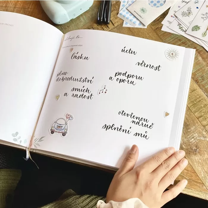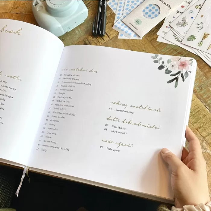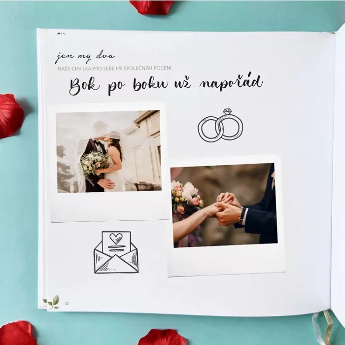 V knihe nájdete aj miesto na odkazy od svadobčanov a priestor pre fotografie. Môžete si v ňom taktiež naplánovať ideálny svadobný deň. Všetky spomienky na tento veľký deň tak budete mať už stále na jednom mieste.