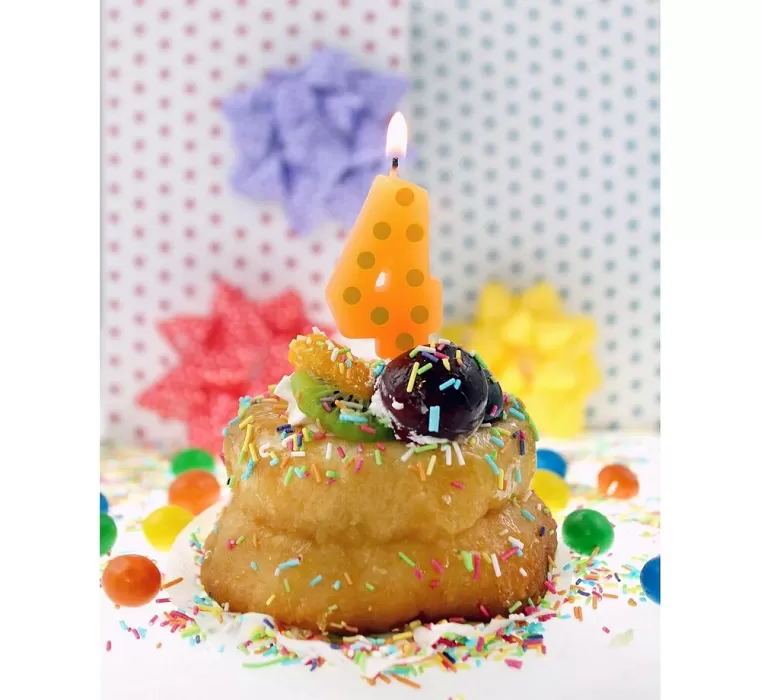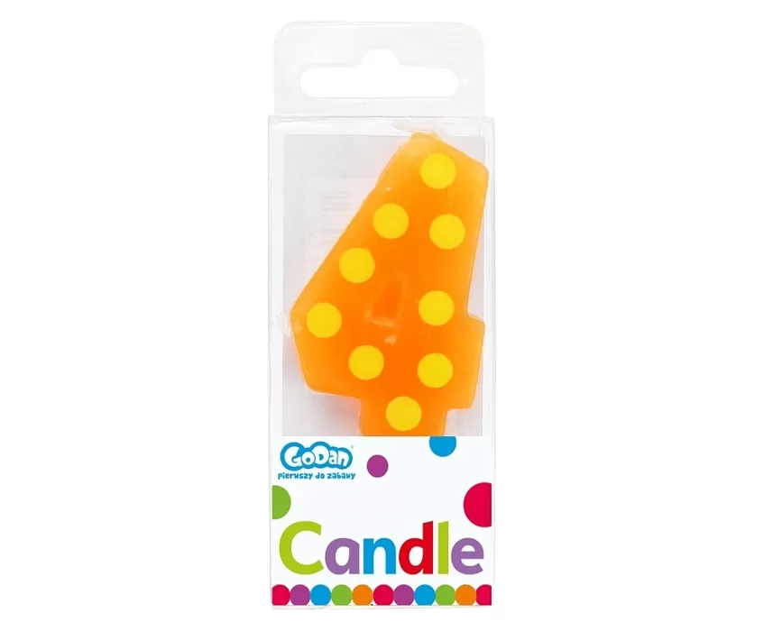 Sviečka v tvare číslice 4 v oranžovej farbe, zdobená žltými bodkami.