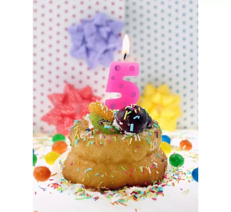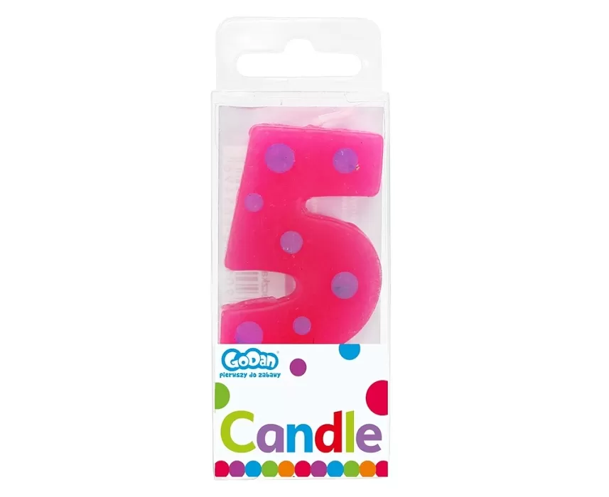 Sviečka v tvare číslice 5 v ružovej farbe, zdobená modrými bodkami.