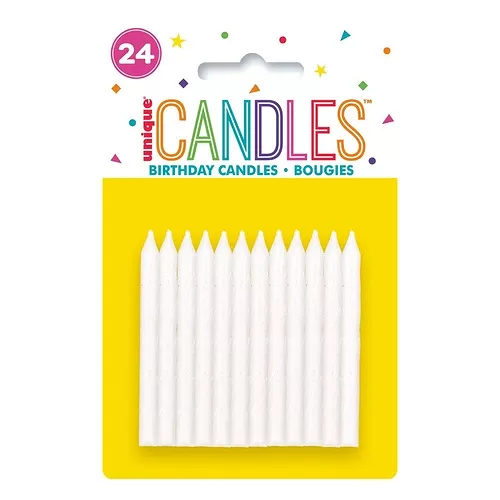 Sviečky tortové - biele dúhovo trblietavé špirály, 24ct
