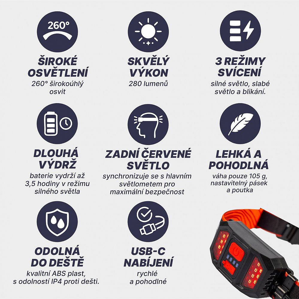 Pôsobivé a široké osvetlenie: Vďaka inovatívnemu svetelnému zdroju COB (Chip-on-Board) poskytuje čelovka 260-stupňový širokouhlý osvit, ktorý zaisťuje vynikajúce periférne videnie a jasný prehľad o okolí. S jasom 280 lúmenov máte istotu, že uvidíte všetko potrebné. Už žiadne tmavé okraje vášho zorného poľa! Navyše hlavne vďaka tomuto zdroju budete výrazne vidieť.