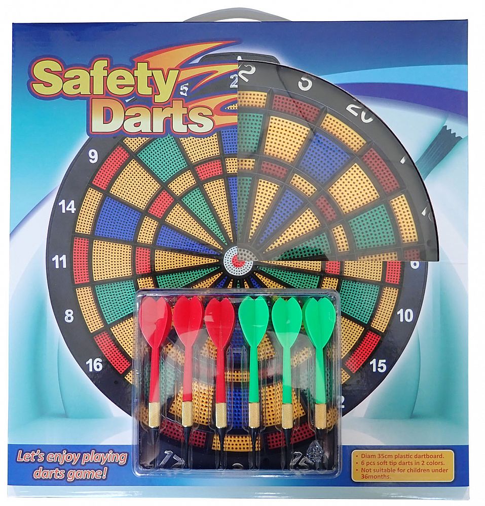 Terč softový - dierkovaný 36 cm, + 6 šípok s plastovými hrotmi. Bezpečný typ terča. Ide o rovnakú konštrukciu ako majú elektronické terče. Balenie softového terča je v potlačenej papierovej krabici.