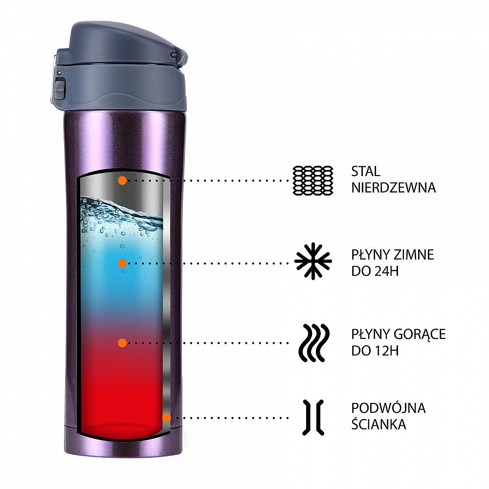 Termoska je vyrobená z nerezovej ocele s dvojitou stenou, ktorá zaručuje uchovanie teplých nápojov po dobu 12 hodín a studených po dobu 24 hodín, nezáleží teda, či si do termosky pripravíte rannú kávu, ktorú vypijete v kancelárii alebo či si do nej zalejete obľúbenú limonádu a vezmete si ju so sebou na niekoľkohodinovú prechádzku do prírody, termoska udrží Váš nápoj v správnej teplote.